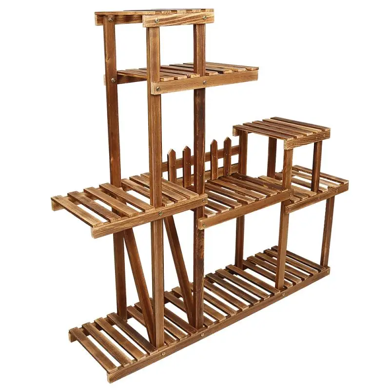 1. Сосновая древесина карбонизирована при высокой температуре 300 градусов, что повышает устойчивость к деформации; Вы можете положиться на ее водонепроницаемые и антикоррозийные функции. Подставка для растений с прочной рамой выдерживает 10 кг на каждой полке