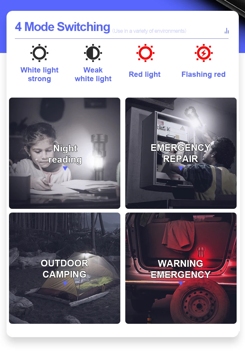 Фонарик использует фитиль XHP160 и боковой COB. Это профессиональный высококачественный фонарик, подходящий для любителей ночной деятельности, которым нравится рыбалка и кемпинг. Это также идеальный уличный фонарик для ночного чтения, путешествий на открытом воздухе, приключений и путешествий на большие расстояния.