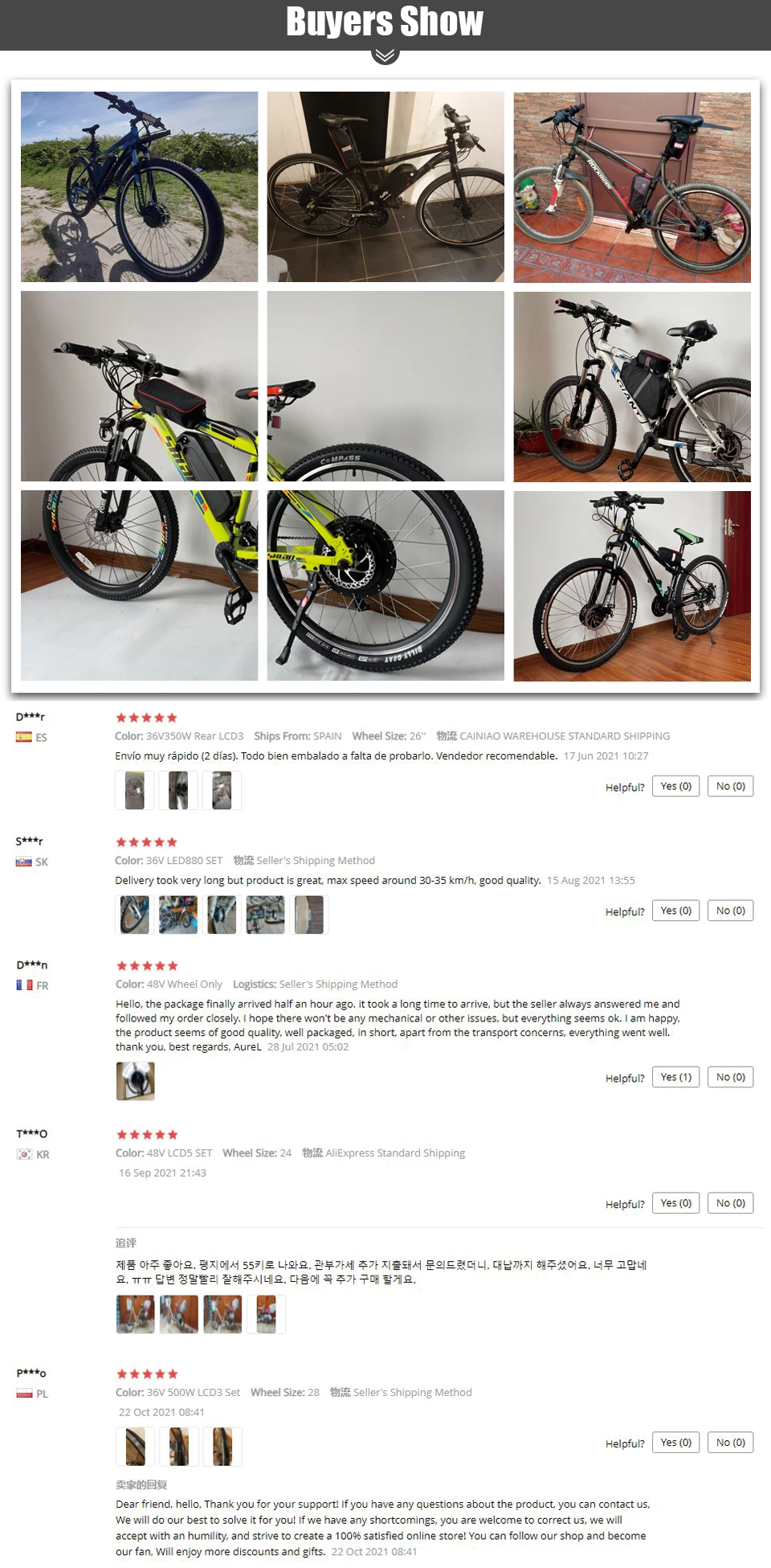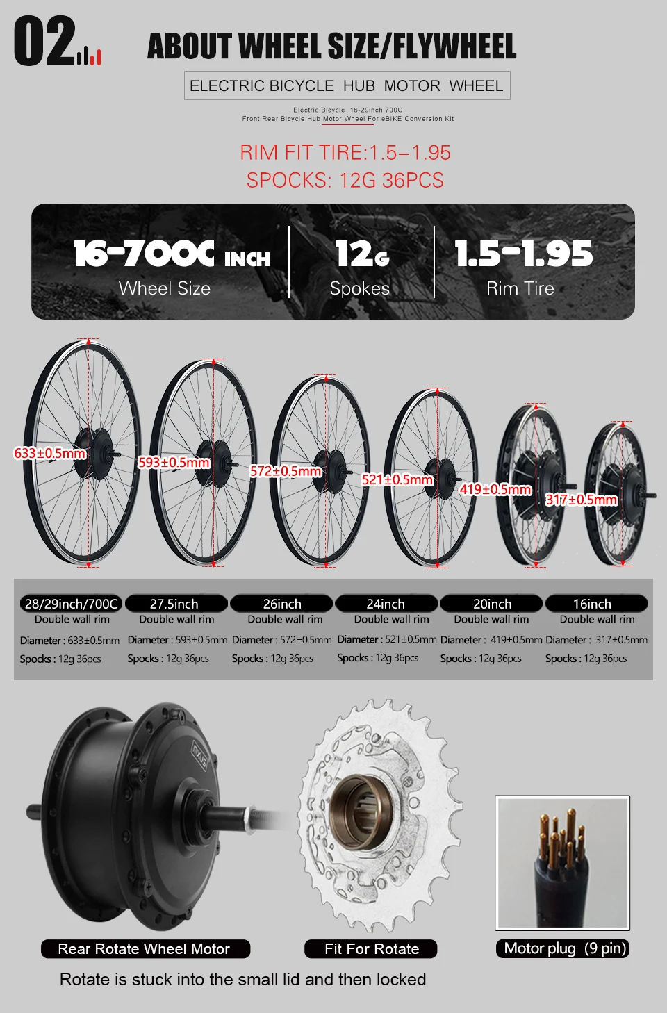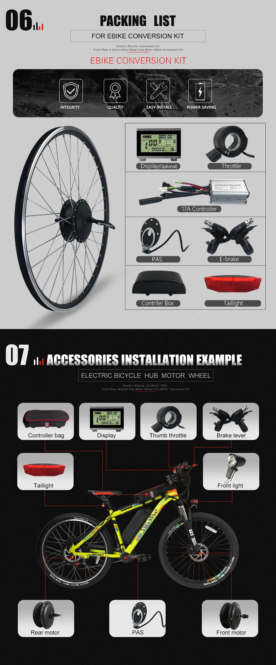▶ Конверсионный комплект В комплект не входят аккумуляторы, свободные колеса, шины, дисковые тормоза и усилитель крутящего момента. (Если вам нужны аккумуляторы, свободные колеса, шины, дисковые тормоза, усилитель крутящего момента, пожалуйста, свяжитесь с нами для дополнительных затрат) Если вы выбираете «только колеса», есть только одно электрическое колесо, без других аксессуаров; ▶ Если вам нужно свободное колесо, дисковый тормоз, усилитель крутящего момента, есть ссылка, чтобы компенсировать разницу в нижней части страницы деталей, или, пожалуйста, свяжитесь с нами; ▶ PAS, дроссельная заслонка и E-brake в комплекте являются дополнительными. Если вам нужно заменить его, пожалуйста, посмотрите ссылку, чтобы компенсировать разницу в нижней части страницы деталей, или, пожалуйста, свяжитесь с нами. ▶ Пожалуйста, обратитесь к форме списка упаковочных продуктов. 【Особенности продукта 】 Этот продукт может легко превратить ваш обычный велосипед в электрический велосипед. Это на сотни долларов дешевле, чем покупка нового электрического велосипеда. Для успешного преобразования требуется 1-2 часа. Мы поставим руководство по установке в коробку. И мы дадим вам пакет контроллера в подарок! 【Упаковочный лист 】 ① 350 Вт заднее колесо x1 (без шины) ② Контроллер 15A x1 ③ Дисплей и руководство x1 ④ Дроссельная заслонка x1 ⑤ Выключатели питания тормозные рычаги x1 ⑥ Датчик PAS x1 ⑦⑦ Застежка-молния и защитная линия x1 ⑧ Удлинитель двигателя x1 ⑨⑨ Подарок! Сумка контроллера x1 【 Набор для преобразования электровелосипеда Двигатель: ◆ Номинальное напряжение: 36V 48V ◆ Номинальная мощность: 350 Вт ◆ Номинальная скорость: Около 25-28 км/ч ◆ Об/мин: 231-270 об/мин ◆ Крутящий момент (Н. М): 31,8-33 Н. М ◆ Задняя вилка (мм): 135-142 мм ◆ Тип тормоза: V/дисковый тормоз ◆ Тип: Бесщеточный мотор-редуктор ◆ Место установки: Заднее колесо ◆ Подпорка С двухстенным ободом из алюминиевого сплава с 36 люверсами, спицами из нержавеющей стали ◆ Нагрузка ≤ 200 кг ◆ Длина кабеля двигателя: 200 мм ◆ Размер колеса: 16 дюймов 20 дюймов 24 дюйма 26 дюймов 27,5 дюйма 28 дюймов 29 дюймов 700C колесаКонтроллер: