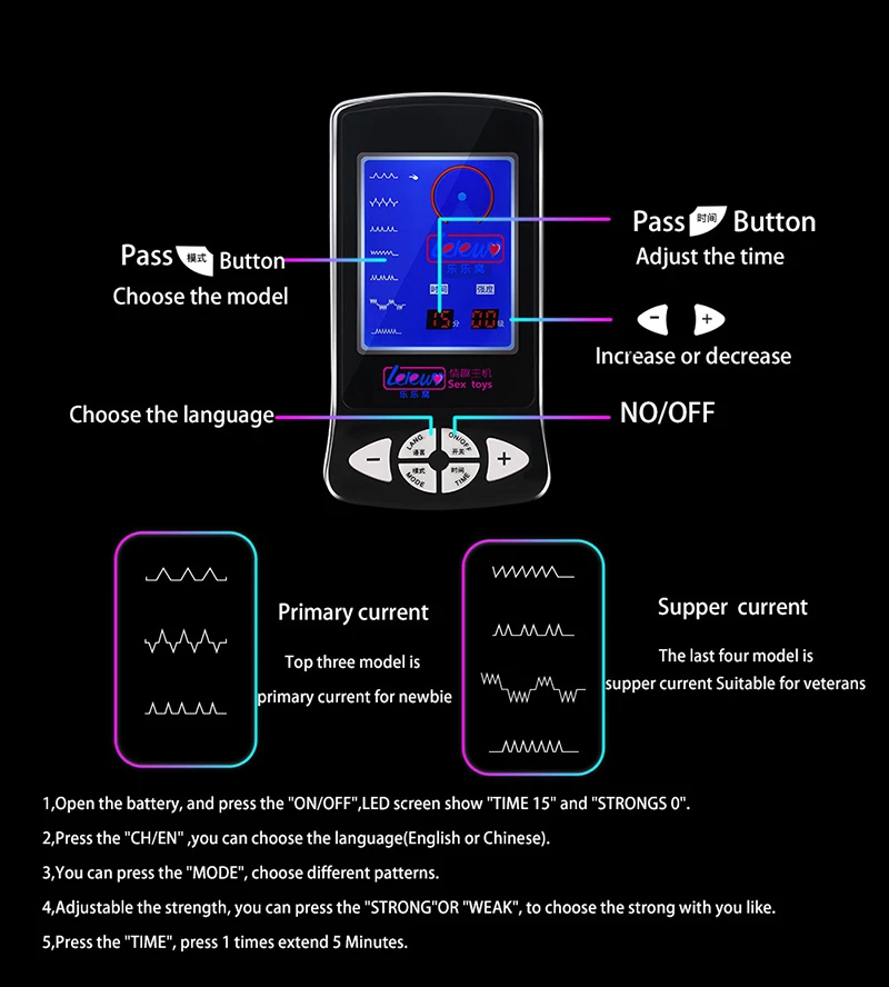1.. Потому что сила имеет сильное электро шок чувство, если это первый раз, чтобы использовать eletro shock Медицинские игрушки, пожалуйста, поверните на минимальную частоту, когда вы открываете силу, принимает части, закрывающие тело человека. Если вы выбираете сильную силу, вы можете почувствовать боль.