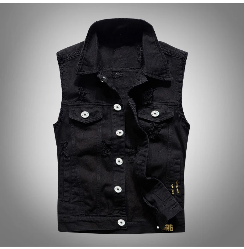 Отзывы о Мужской джинсовый жилет с буквенным принтом приталенный дырками и бахромой