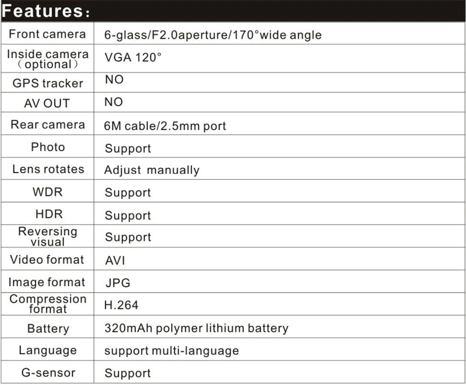 ● Основные функции: g-сенсор, циклическая запись, обнаружение движения, монитор парковки, отображение времени и данных, широкий динамический диапазон, отображение изображения в картинке, Автоматическое включение/выключение