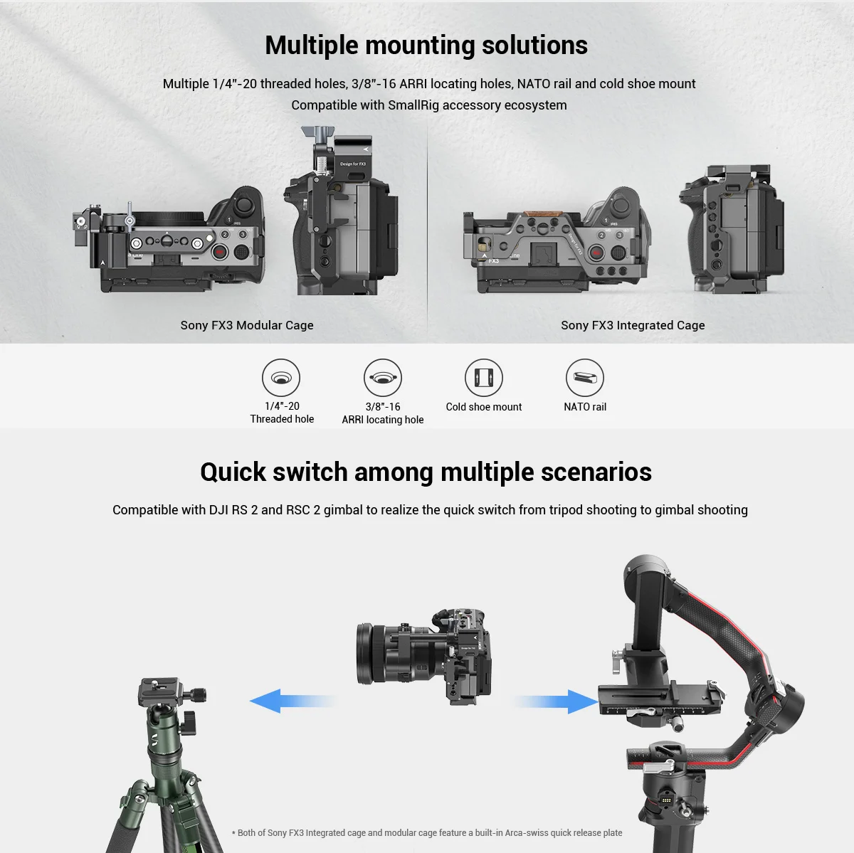 SmallRig клетка для Sony FX3 Кинокамера 3277Предназначен для обеспечения защиты и аксессуаров монтажных точек для видеосъемки. Он крепится к камере двумя винтами 1/4 "-20 для предотвращения скручивания, с одним на дне и одним на правой стороне. С несколькими резьбовыми отверстиями 1/4 ”-20, которые позволяют устанавливать широкий спектр аксессуаров, таких как боковые ручки 2093, верхние ручки XLR 3082 и держатель банка питания BUB2336. Его Верхние особенности крепление холодной обуви для прикрепления микрофона, светильник или звукового приемника и т. Д. Клетка также обеспечивает несколько отверстий ARRI 3/8 " -16 для размещения ручки 2165 и 2903 крепления монитора. Левая сторона поставляется с коротким Рельсом для крепления боковой ручки 2187. Нижняя часть интегрирует Arca швейцарская тарелка позволяет держать камеру на RS 2 и RSC 2 gimbal непосредственно, чтобы конвертировать ручную съемку в gimbal съемку. В комплект входит отвертка с плоской головкой для крепления винта камеры и хранения его в нижней части клетки. Кроме того, специальный зажим кабеля HDMI включен для защиты кабеля HDMI и обеспечения стабильности сигнала. Каждая Сторона поставляется со слотом для ремня для камеры. Клетка поставляется с защитными резиновыми прокладками и поддерживает доступ ко всем кнопкам, слотам и дверям аккумулятора.