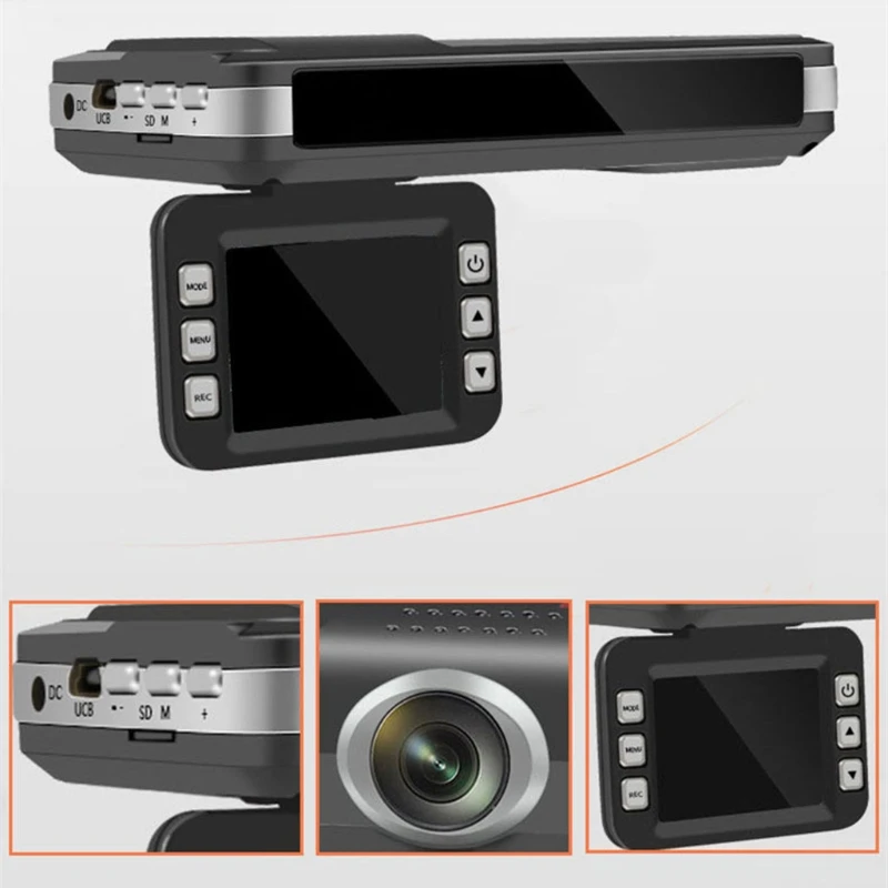 Equipped with 1080P HD- camera, with night vision function, even at night can be clearly recorded.,The sensitive G-sensor sutomatically detects a sudden collision and immediately saves the relevant footage and restored accident scene.,Full glass lens, 140° wide Angle, the field of vision can safely cover 4 lanes, can restore the driving situation.,It is fixed by electrostatic paste, easy to install or move, and avoid the risk of falling off.,With the 2 in 1 function of radars detector and car DVR, it can record the driving state and effectively reduce the road violation behavior.,