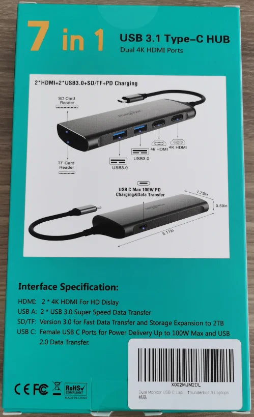 Material: Aluminum Alloy Interface: 1 * USB 3.1 Type-C connector cable(Built-in) 2 * USB 3.0 Type-A port 2 * HDMI output port, single 4k@60hz 1 * SD card slot 1 * TF card slot 1 * USB C For both Data and PD Length: 15cm Power Delivery : 87W , MAX 100W USB C Port: For Power Charging and Data Transmission, Speed 5Gbps Color: Space Gray Support Mode: Mirror Mode and Extend Mode Quick User Guide: 1. ONLY compatible with DP Alt Mode (video signal output)devices. 2. ONLY work with video-enabled USB-C devices for any video output. 3. Feel free to find our customer support team with any questions on product & compatibility. (✔) Compatible laptops lists. • (✔) MacBook:MacBook Pro (Late 2016 and newer), MacBook (Early 2015 and newer), MacBook Air (Late 2018 and newer) • (✔) Apple:iPad Pro (2020 / 2018), iMac (Mid 2017 and newer), iMac Pro; Mac Mini (Late 2018 and newer) • (✔) Microsoft:Microsoft Surface Book 2, Surface Go, Google Chromebook Pixel (2015), Pixelbook; Pixel Slate • (✔) Dell:Dell Latitude 7373 / 5570 / 5490 / 5400 (2019), XPS 13 / 15 • (✔) Samsung:Samsung Galaxy S20 / S20+ / S20 Ultra / S10e / S10 / S10+ / Note 20 / Note 9, S8 / S8+ / S9 / S9+ • (✔) Phones:HTC 10 / U Ultra / U11 / U11+ / U12+, Asus ZenFone / ROG Phone and more.