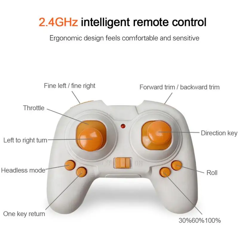 Функция: вверх/вниз, поворот влево/вправо, вперед/назад, левый/правый боковой полет, Безголовый режим, возврат одной кнопки, барометр, установка высоты и т. д.