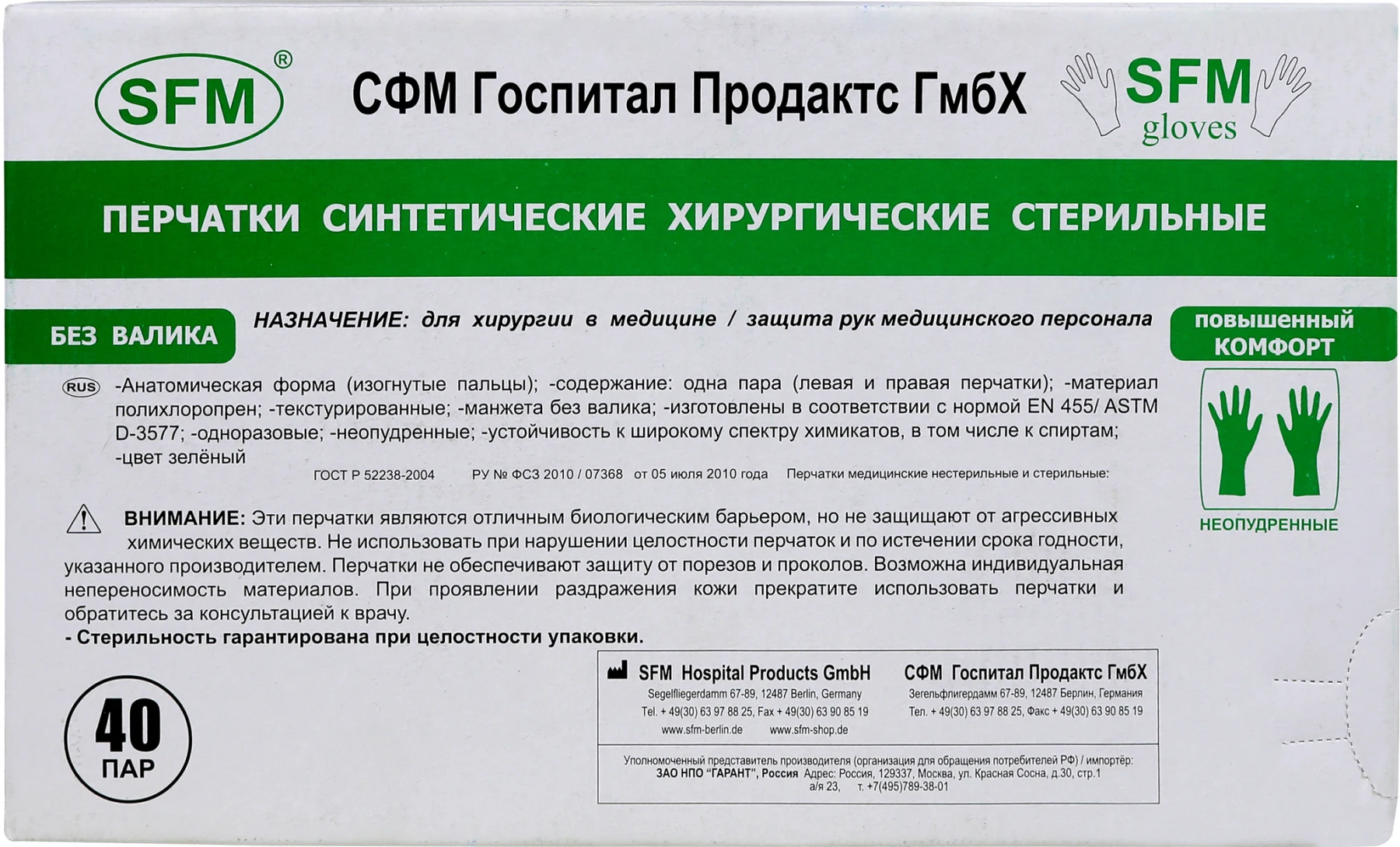 Перчатки синтетические стерильные полихлоропреновые Перчатки синтетические стерильные полихлоропреновые созданы для дополнительной защиты пациентов и пользователей во время хирургических операций, лечения и обследования. Перчатки синтетические стерильные полихлоропреновые имеют изогнутые пальцы для анатомической конструкции, чтобы уменьшить усталость рук. Перчатки из неопрена имеют текстурированную поверхность по всей площади, чтобы избежать скольжения. Перчатки оптимизированы для влажного надевания. Манжета - без валика. Перчатки синтетические стерильные полихлоропреновыеподходят только для одноразового использования. Производство SFM Hospital Products GmbH, Германия Характеристики зелёного цвета; материал - полихлоропрен (неопрен); анатомические (с разделением на правую и левую руки); текстурированные, микрошероховатая поверхность по всей площади; неопудренные; стерильные; манжета от 290 мм; срок годности - 5 лет.