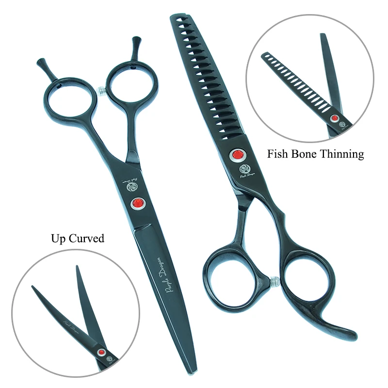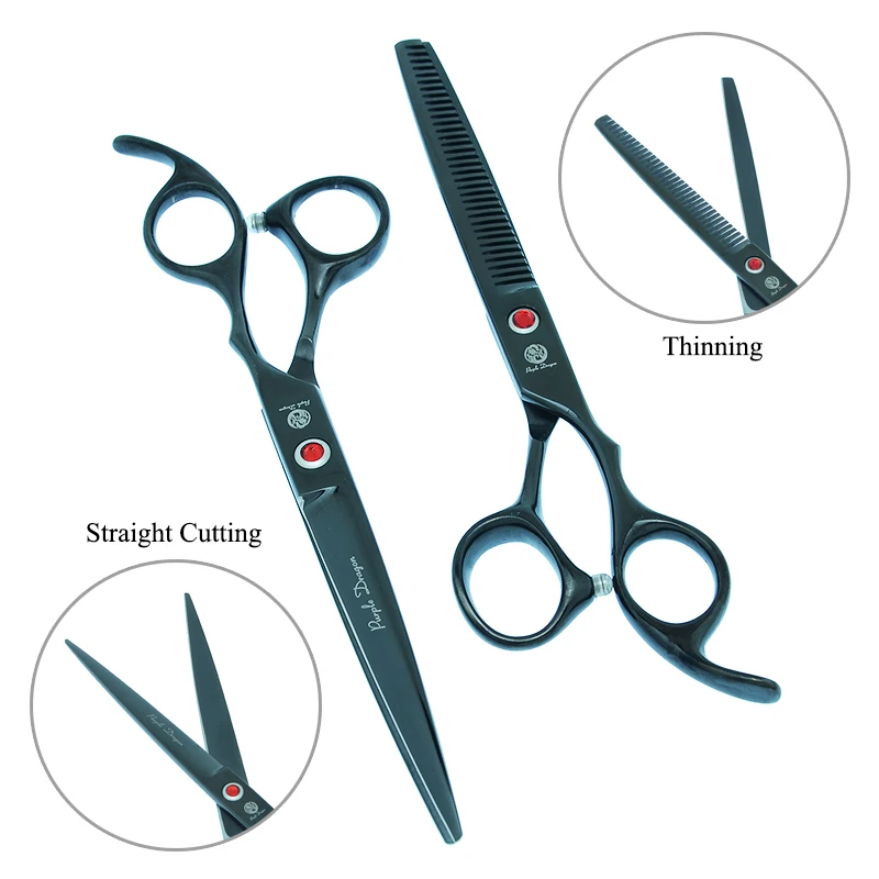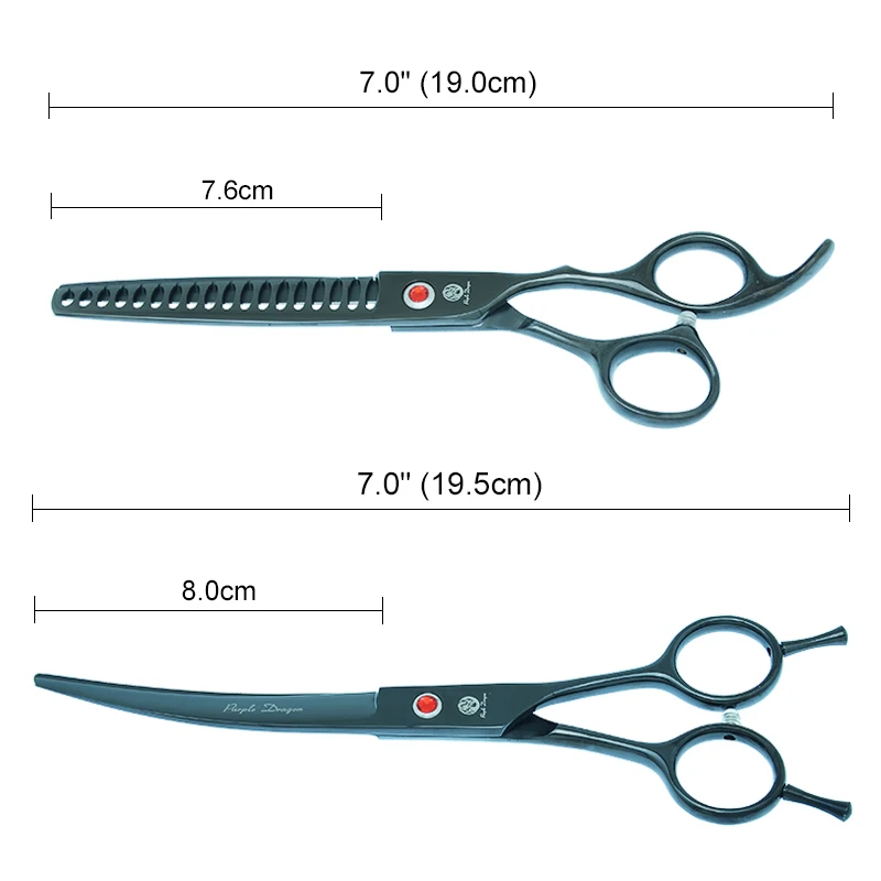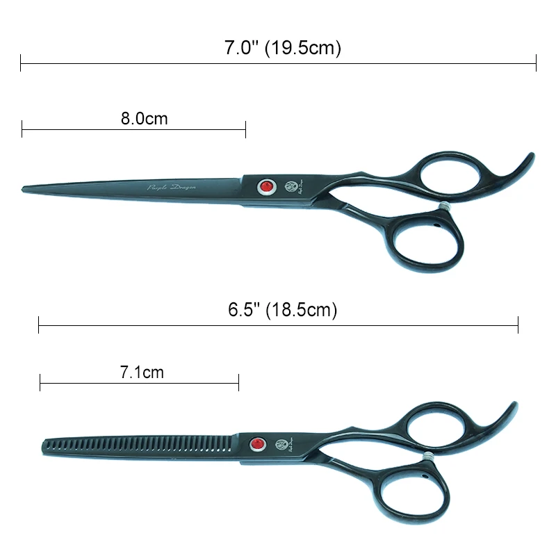 Ножницы для стрижки собак, 7,0 дюйма, фиолетовый дракон, 440C Тип товара: Профессиональный парикмахерский инструмент для укладки домашних животных Наименование товара: ножницы для груминга домашних животных Материал: Япония 440c Твердость: 62HRC Размер ножниц для резки: 19,5 см (7 дюймов) Размер филировочных ножниц: 19 см (7 дюймов) 18 зубьевРазмер филировочных ножниц: 18,5 см (6,5 дюйма) 34 зуба Цвет: черный как на фото Набор с сумкой (4 шт. Ножниц) 1. 1 шт. ножницы с прямой головкой 2. Филировочные ножницы 2шт (18 зубцов и 34 зуба) 4. 1 шт. ножницы с изогнутой головкой 5. Расческа 1 шт. 6. 1 шт. Руб из овчины 7. 1 шт. регулятор 8. 1 шт. Пинцет для животных (вы выбираете набор в том числе, он будет иметь, иначе, если у вас нет) 9. 1 шт. сумка для ножниц