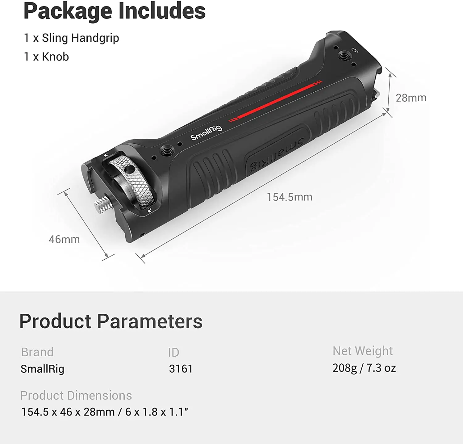 SmallRig слинг рукояткаДля DJI RS 2 / RSC 2 Карданный 3161Специально разработан, чтобы уменьшить усталость рук при съемке под низким углом с карданного шарнира и обеспечить дополнительные монтажные точки. Ручка крепится к ручке DJI R с винтом 1/4 ”-20 и принимает приподнятую кромку для предотвращения скручивания. Есть два резьбовых отверстия 1/4 ”-20, один ARRI 3/8”-16 локализационных Хола и одно крепление для холодной обуви в верхней части ручки для крепления монитора Mount2903or2905. С 1/4 установочными отверстиями сбоку для крепления DJI R смартфона зажим orMagic Arm 2070. Ручка имеет встроенный шестигранный ключ для легкой разборки и армирования. Кроме того, есть дополнительная ручка блокировки для замены шлицевого винта ручки портфеля DJI R, а затем вы можете отрегулировать угол без инструментов. OptionalGimbal плечевой ремень kpac2466отдельно доступен для дальнейшего уменьшения усталости руки.