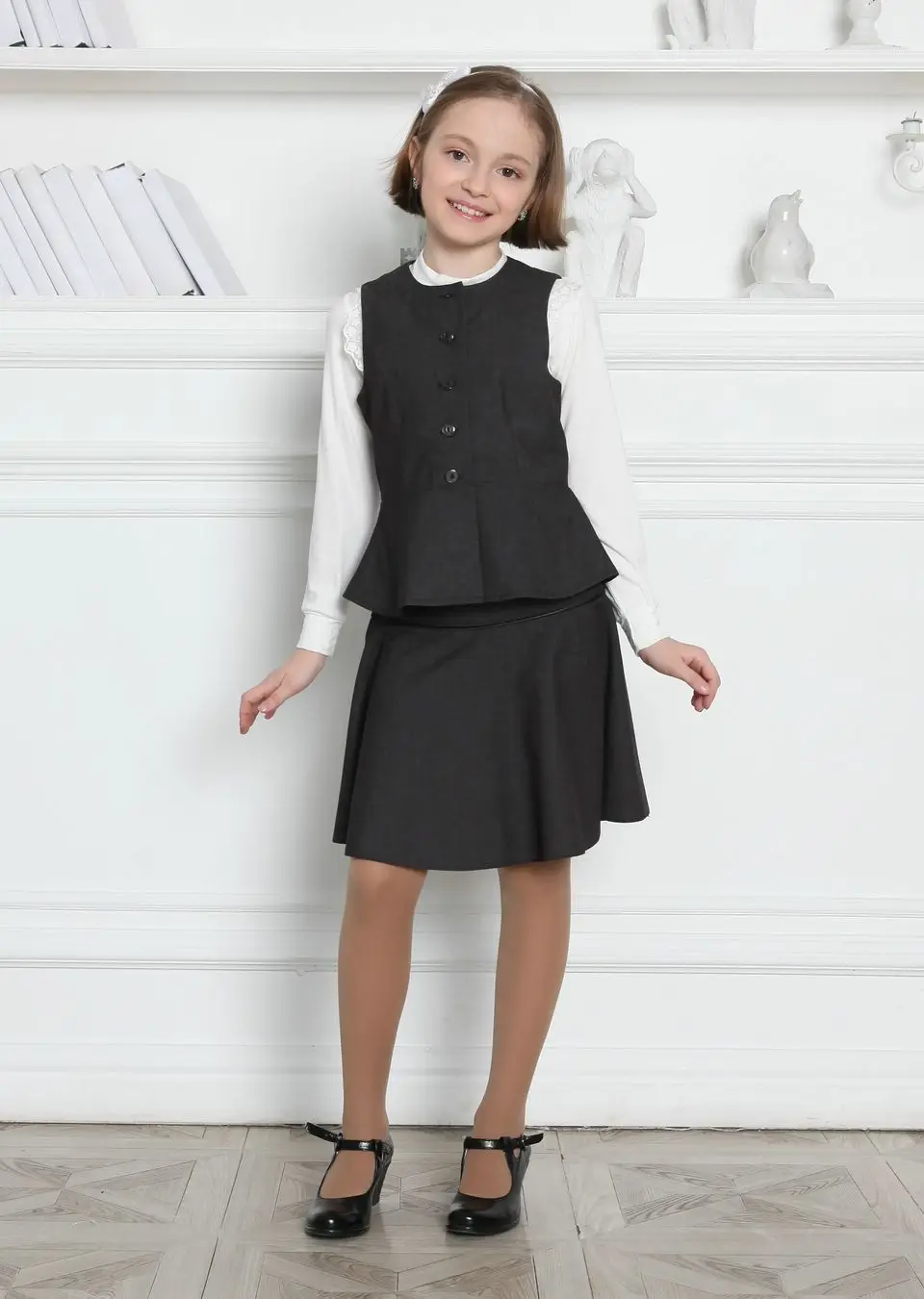 Жилет школьный для девочки из костюмной ткани . Спереди застежка на пуговицы, сзади модель приталена. Аккуратная баска гармонирует с круглым вырезом горловины. Модель подходит для девочек с разными типами фигур. Изделие стирается в машине в режиме деликатной стирки, средствами без отбеливателя, глажка через ткань.