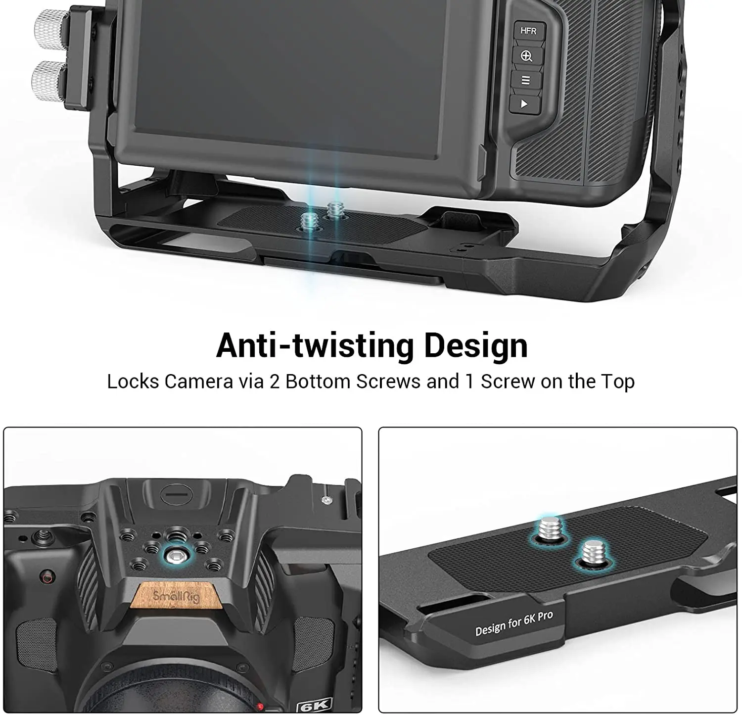 Набор профессиональных аксессуаров SmallRig для BMPCC 6K Pro 3299Имеет прочную клетку из алюминиевого сплава с несколькими резьбовыми отверстиями 1/4 "-20, поддерживающими дополнительные аксессуары для камеры. Боковые ручки NATO подходят к изгибам рук для удобного захвата и предназначены для быстрой сборки и разборки. Sunhood легко снимается и не мешает переворачиванию экрана, поэтому лучше дисплей под сильным наружный светильник. Встроенный T5 SSD зажим и USB-C кабельный зажим дополнительно заблокирован ручкой для предотвращения случайного отключения во время съемки. Кроме того, в комплект входят две закаленные пленки, которые легко наклеиваются на экран с помощью электростатической адсорбции для защиты экрана.