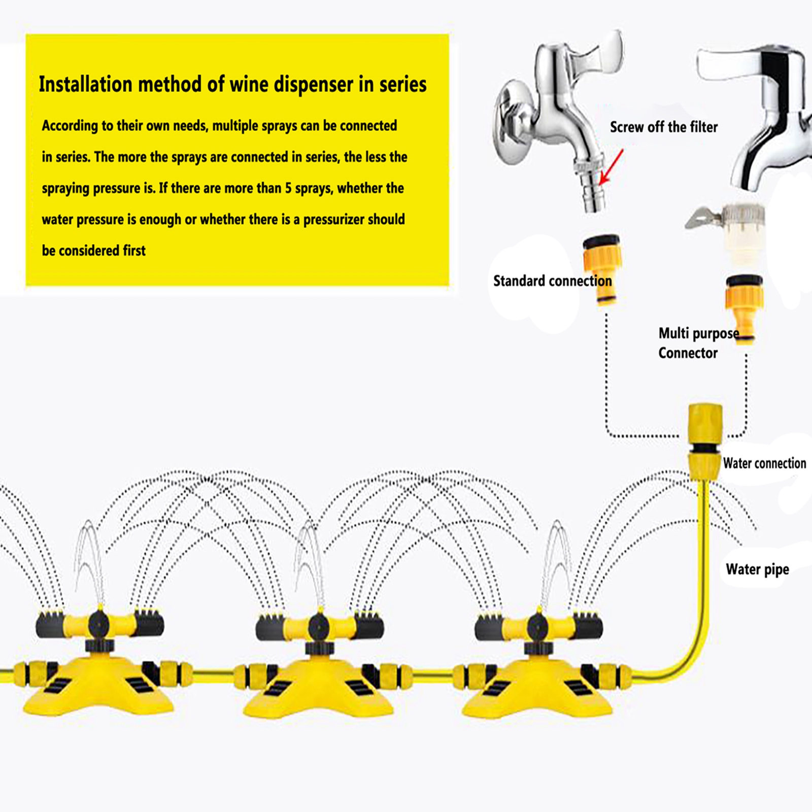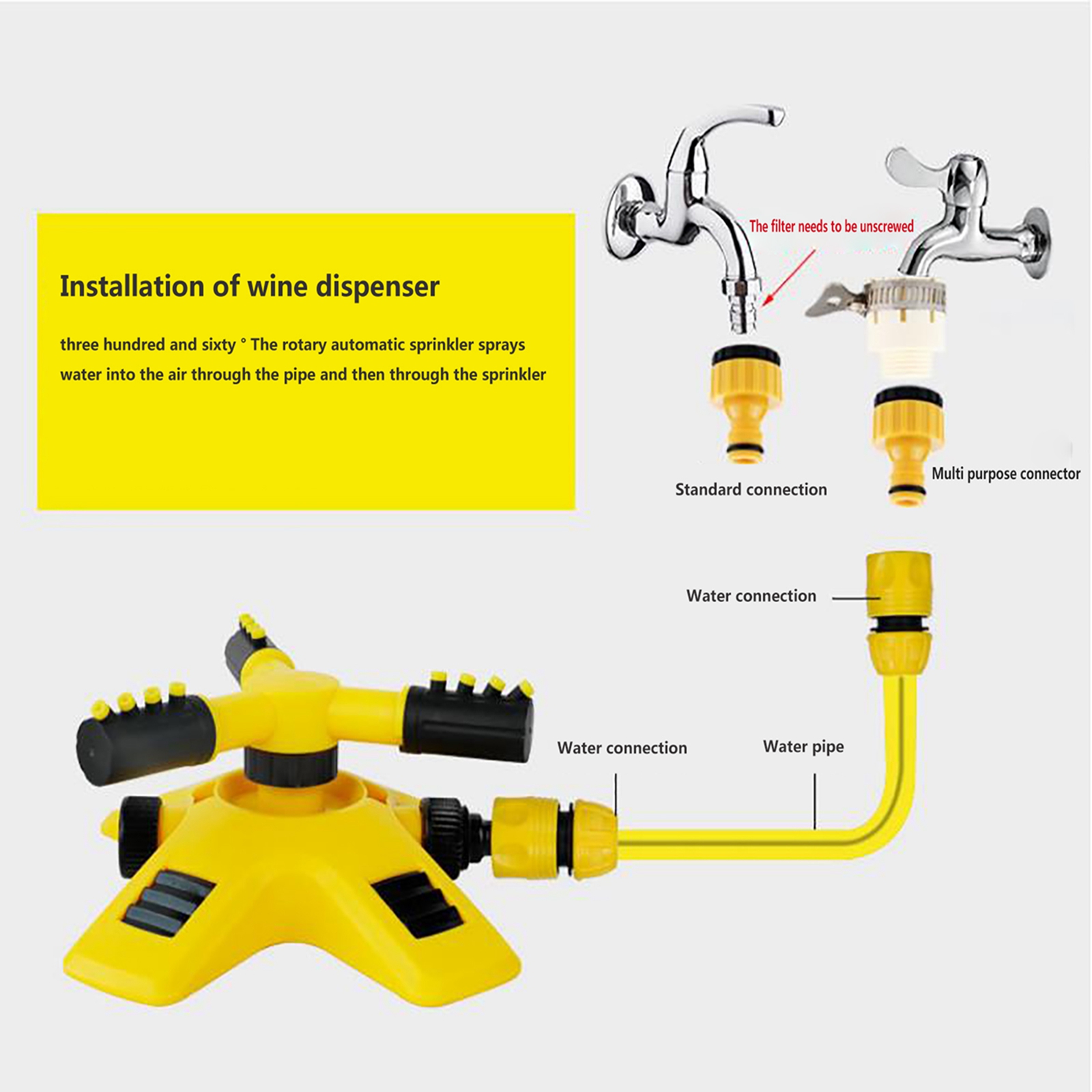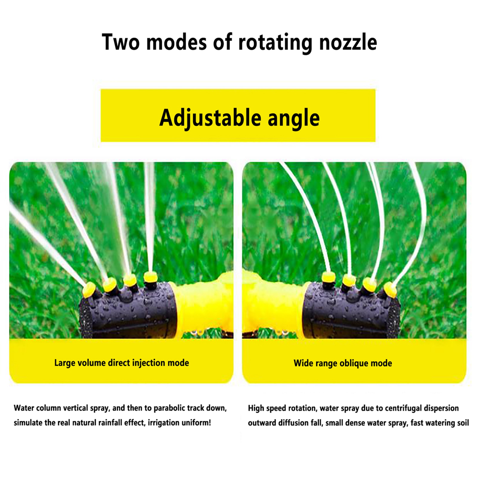 Вода, выбрасываемая из спринклера, плавится равномерно и в дождь. Подходит для орошения сада, ухода за лужайкой, цветами и растениями, посадки в сельском хозяйстве и садоводстве. В жаркие летние дни Наслаждайтесь детьми или домашними животными.Характеристики: