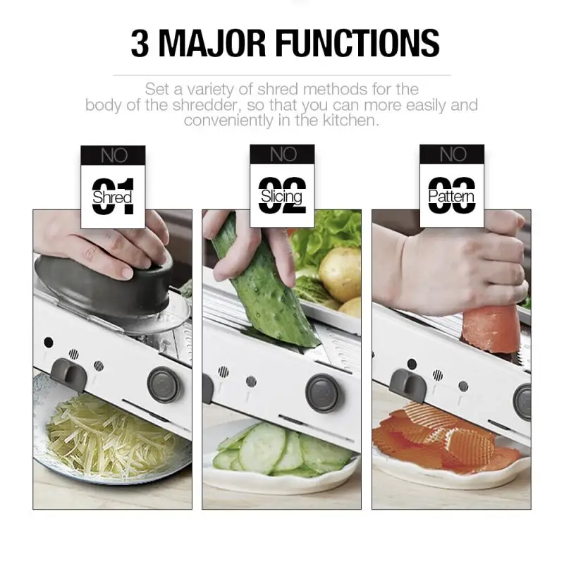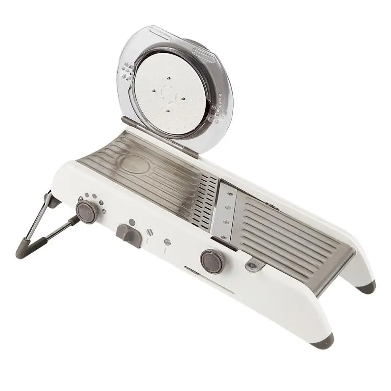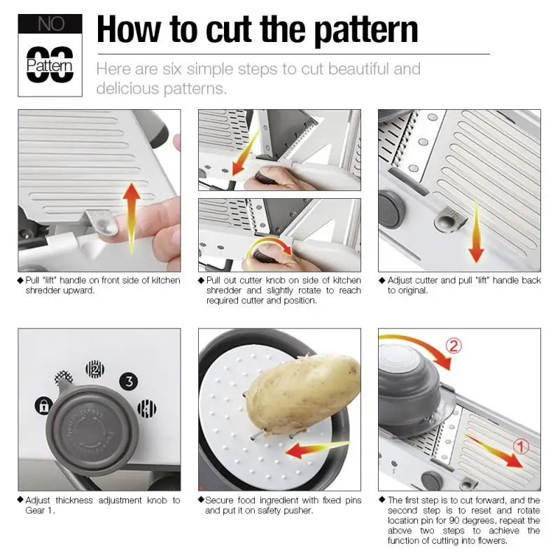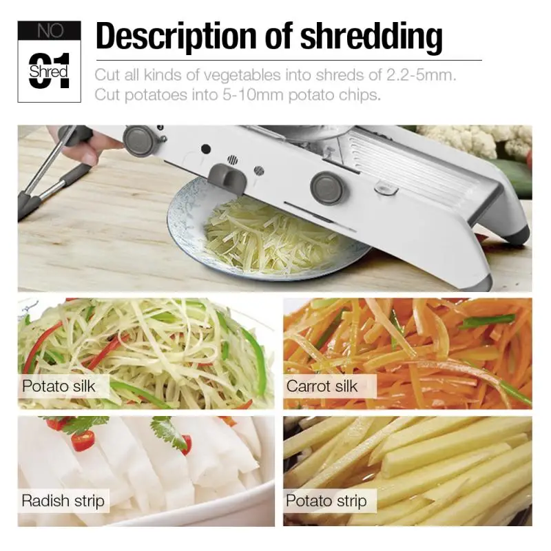 [Безопасный и эргономичный дизайн] Нескользящие ручки и подушечки для ног, регулируемые овощерезки, обеспечивают удобную платформу при резке. Овощерезка мандолина с слайдер безопасности предотвращает прикосновение пальцев к лезвию. Кроме того, имеется блокированная память для обеспечения безопасности.
