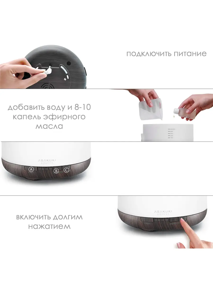 Аромадиффузор представляет из себя ультразвуковой распылитель, принцип работы которого предельно прост: увлажнитель распыляет холодный водяной пар из растворенных в воде эфирных масел. Как результат помимо того, что аромадиффузор создаст замечательную атмосферу за счет красивой подсветки, он еще и наполнит помещение легким приятным ароматом. Увлажнитель воздуха совершенно безопасный для использования в доме даже там, где есть маленькие дети.