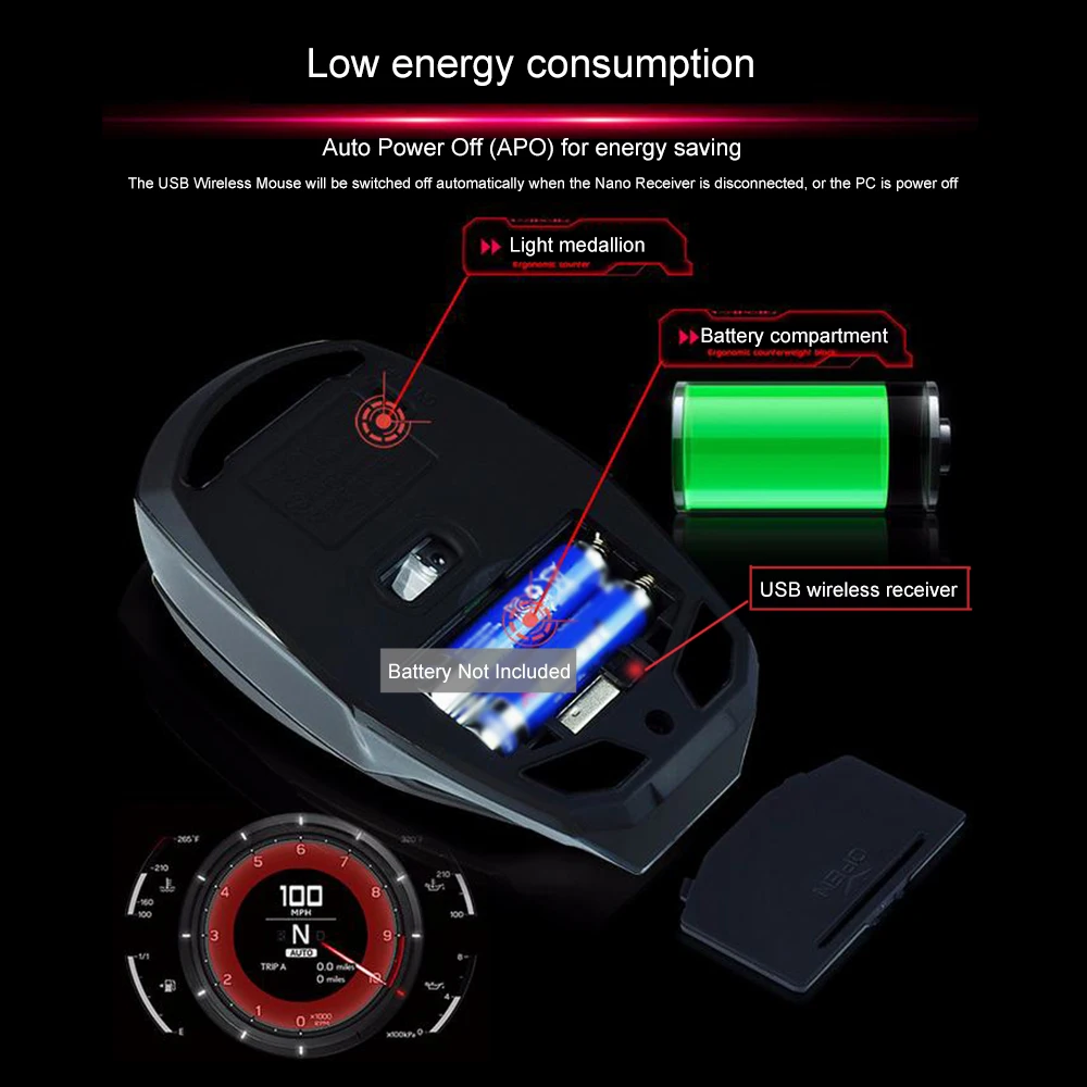 Низкое энергопотребление: Автоматическое отключение (APO) для экономии энергии. Беспроводная usb-мышь будет выключена автоматически, когда нано-приемник отключен, или ПК выключен