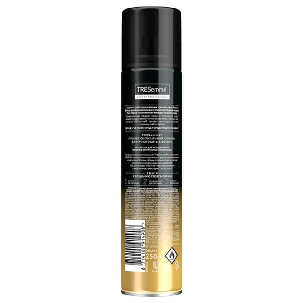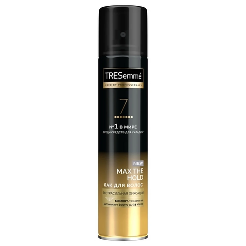 Профессиональная коллекция TRESemme®Благодаря уникальной технологии памяти запоминает форму вашей прически на весь день. Локоны, объем, гладкие волосы-Любой результат укладки надежно зафиксирован! Лак для укладки Max фиксация обеспечивает ультрасильную фиксацию до 24 часов.