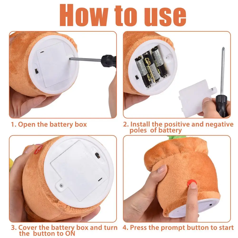 4. Правильный размер: около 30 см, нужны 3 батарейки АА для источника питания (батареи не включены в поставку, вам нужно принести свой собственный). Метод запуска: Установите батарею, включите переключатель в нижней части, а затем нажмите на звуковую пуговица с меткой, Подсолнух может начать пение и танцы.