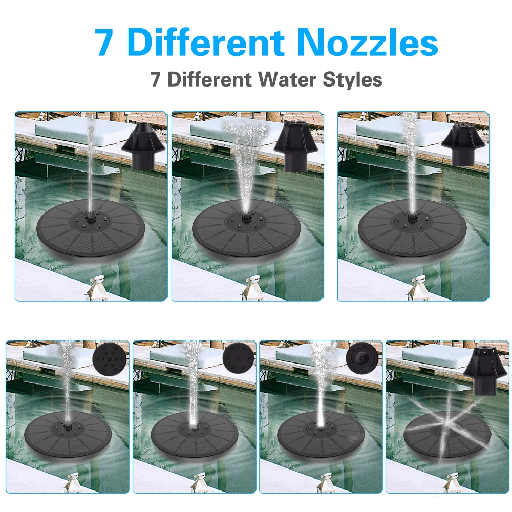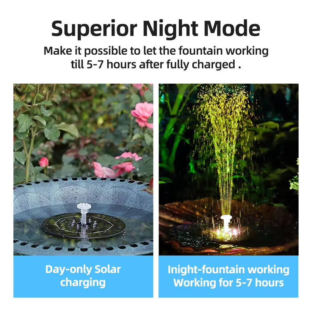 Этот продукт является солнечным водным насосом без внешнего аккумулятора. Высота распыления воды полностью зависит от силы Солнца. Когда солнце слабо, насос не будет работать непрерывно, но автоматически начнет работать до тех пор, пока солнце не достигнет определенной интенсивности после этого, насос возобновит непрерывную работу.