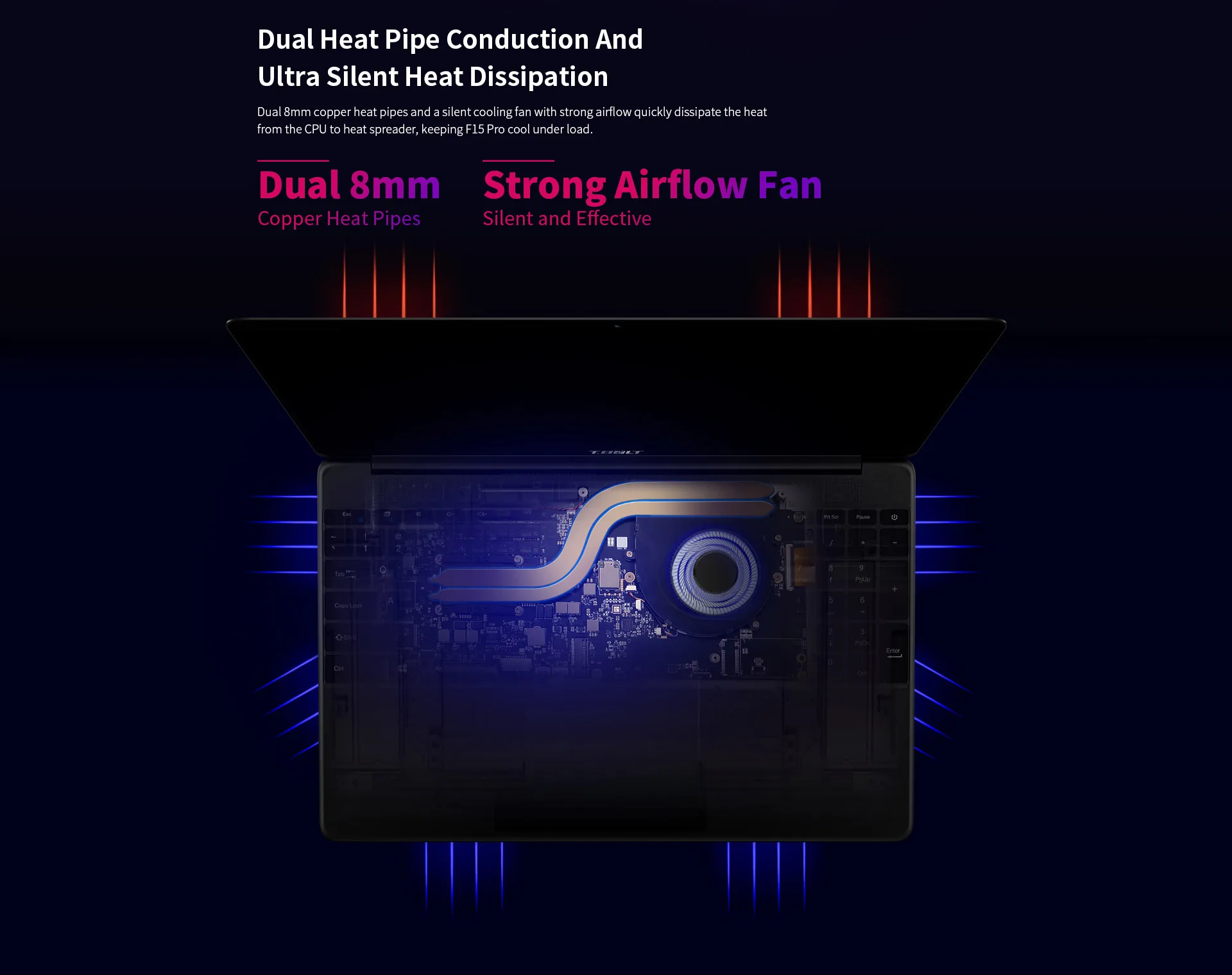 Двойные медные тепловые трубы 8 мм и бесшумный охлаждающий вентилятор с сильным потоком воздуха быстро рассеивают тепло от ЦП к распределителю тепла, сохраняя F15 Pro прохладу под нагрузкой.