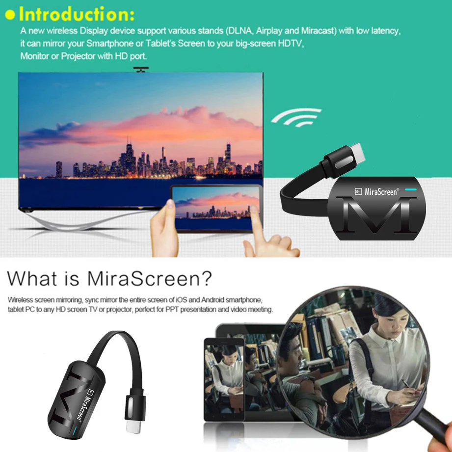 Беспроводное зеркальное отображение экрана, синхронизация зеркального отображения всего экрана смартфона iOS и Android, планшетного ПК к HDTV или проектору, идеально подходит для презентаций PPT и фильма с большим экраном.