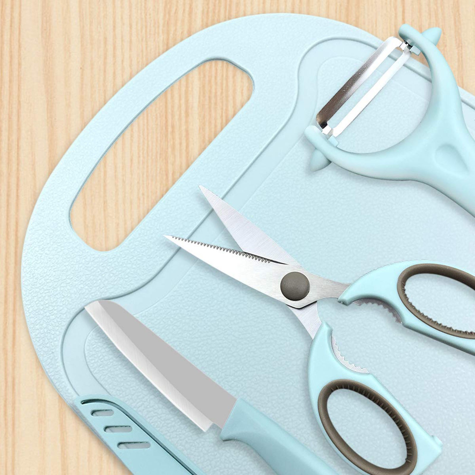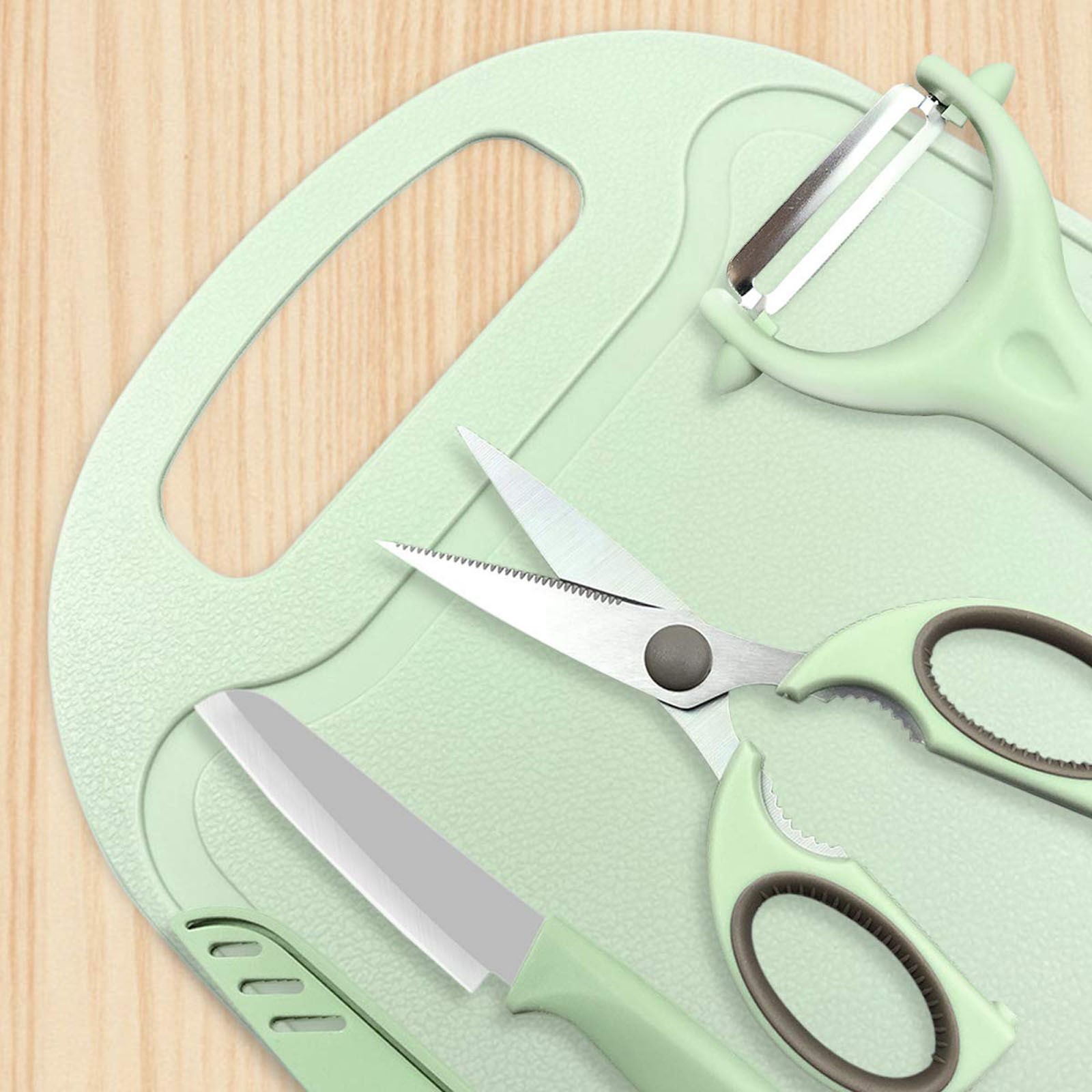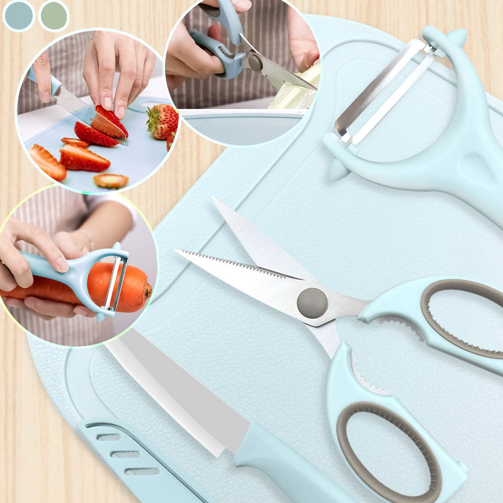 Perfect peeler set: Our 4PCS peeler set is fully equipped, including a fruit knife, a peeling knife, a multi-purpose food scissor and a square cutting board. The small and exquisite kitchen gadget combination can be used to handle fruits and vegetables, making the preparation process before cooking more convenient and quick, can be your considerate kitchen assistant.
