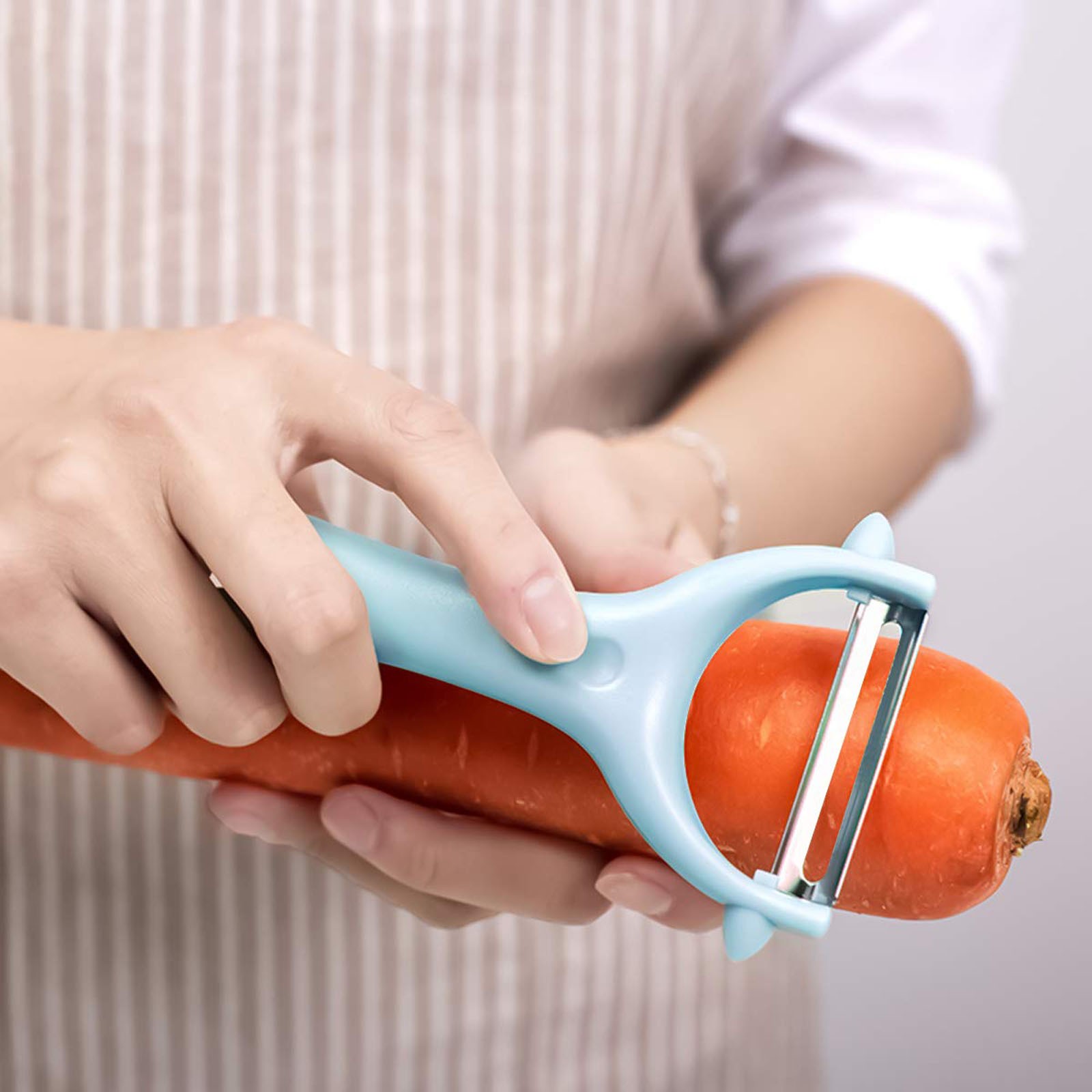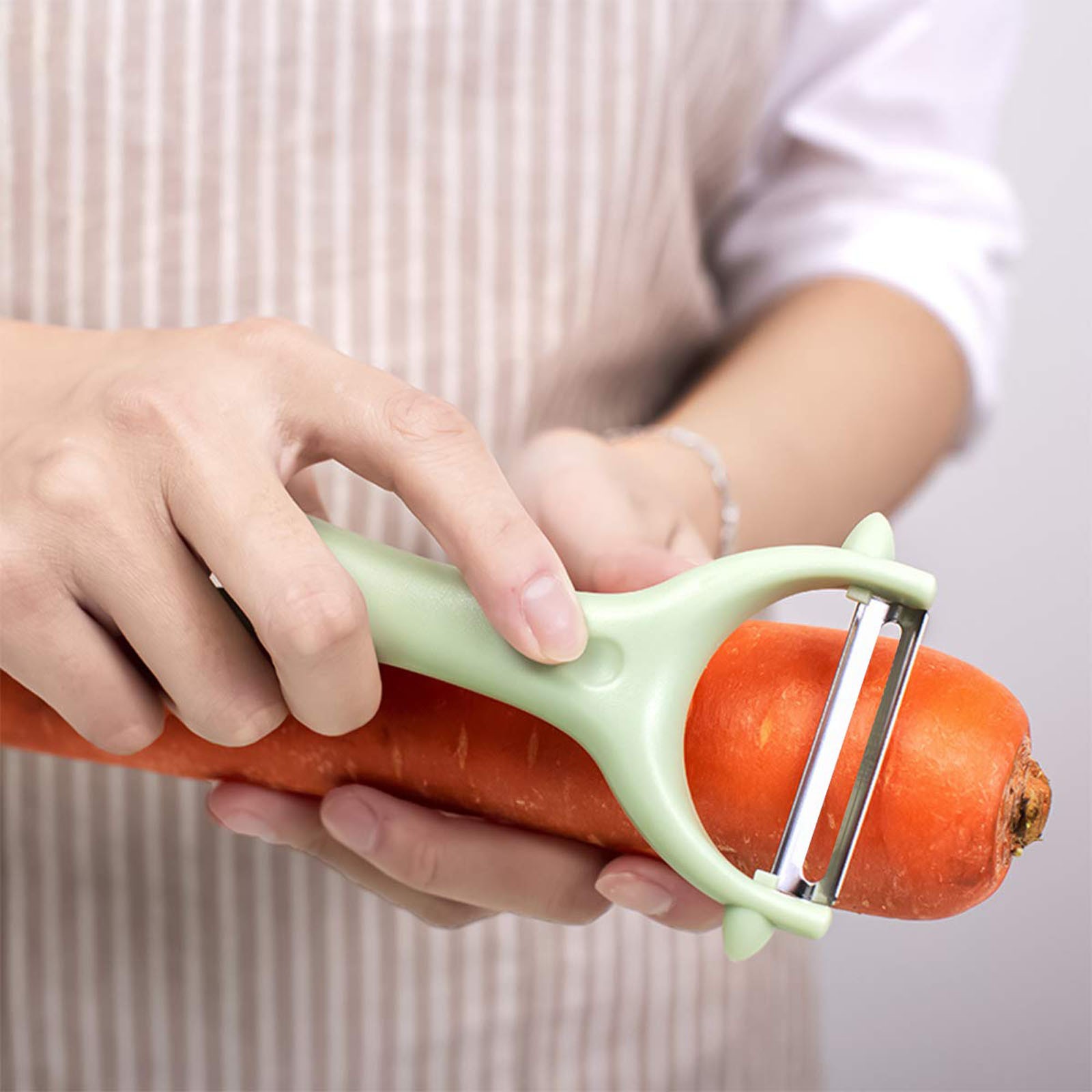 Wide application: The multifunctional vegetables scissors of kitchen vegetable peeler set have sharp cuts, which can be used to cut vegetables and meat easily. The design in the middle of the handle can also be used to open bottle caps and clamp walnuts. At the same time, the digging holes on both sides of the peeler set make it easy to remove the bud eyes on the surface of fruits and vegetables.