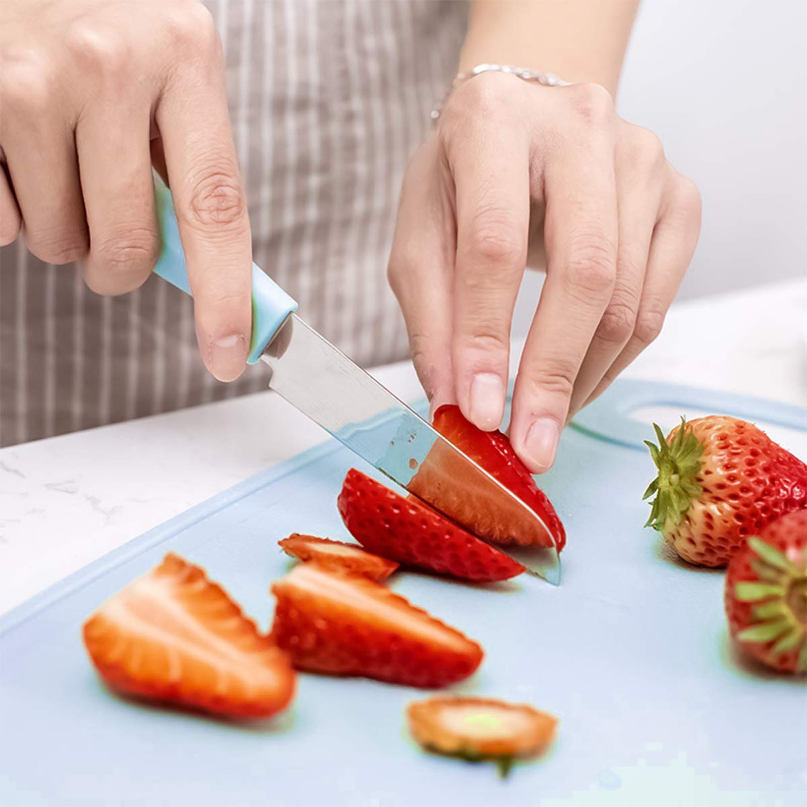 Hook design: Each practical small tool of fruit chopping knife set is equipped with a hanging hole design, which is convenient for storage and hanging. The fruit cutting board is also equipped with a grooved drainage design to ensure the cleanness and no accumulation of water.