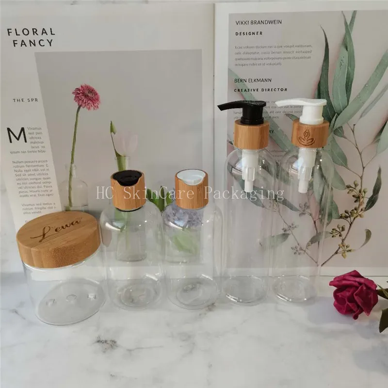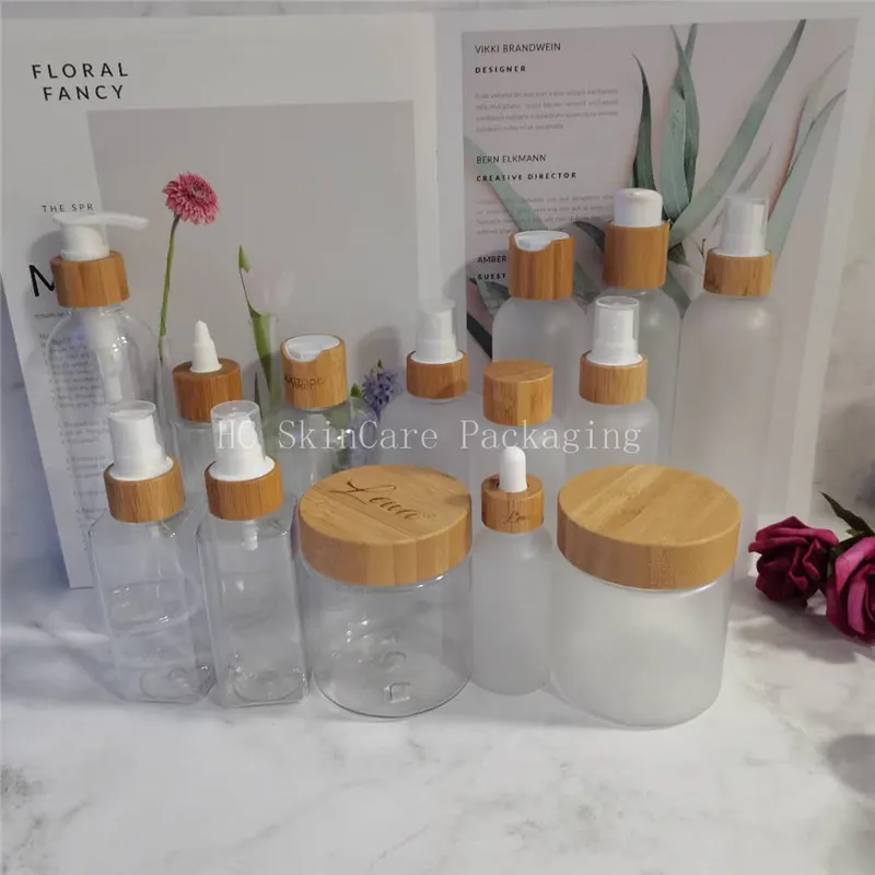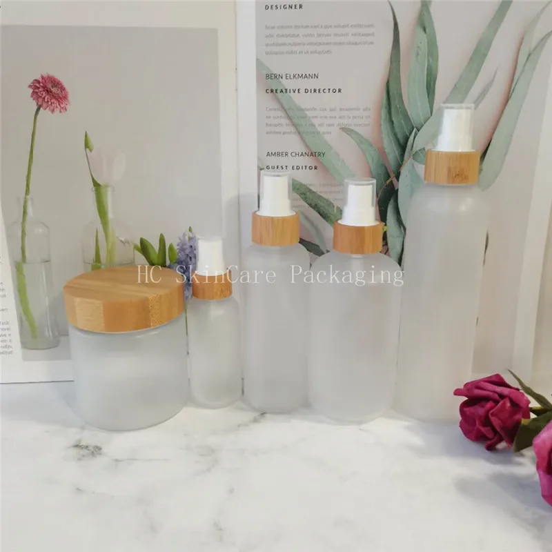 100 шт./лот 60 мл 120 мл 150 мл 250 мл матовая пластиковая бутылка с бамбуковой крышкой диска и пластиковой баночкой для крема пустые косметические контейнеры