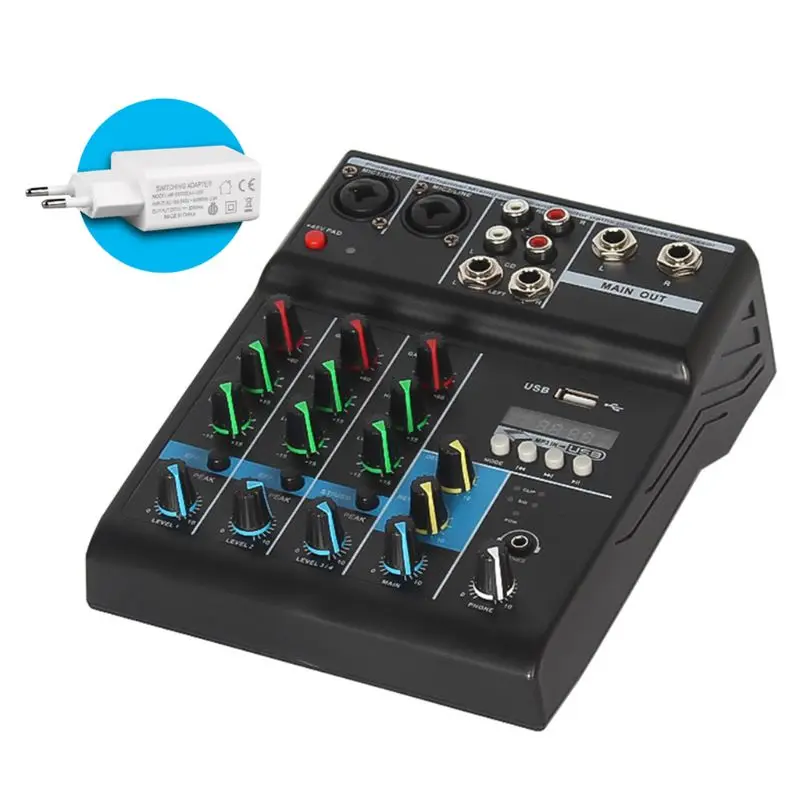 Этот смеситель многоцелевой 4-канальный микшерный пульт с звуковая карта, которые могут удовлетворить потребности пользователя домашний музыкальный производство, сеть в прямом эфире, караоке крышка и так далее.