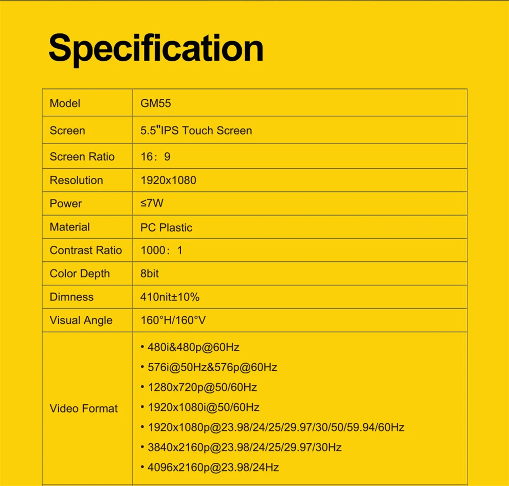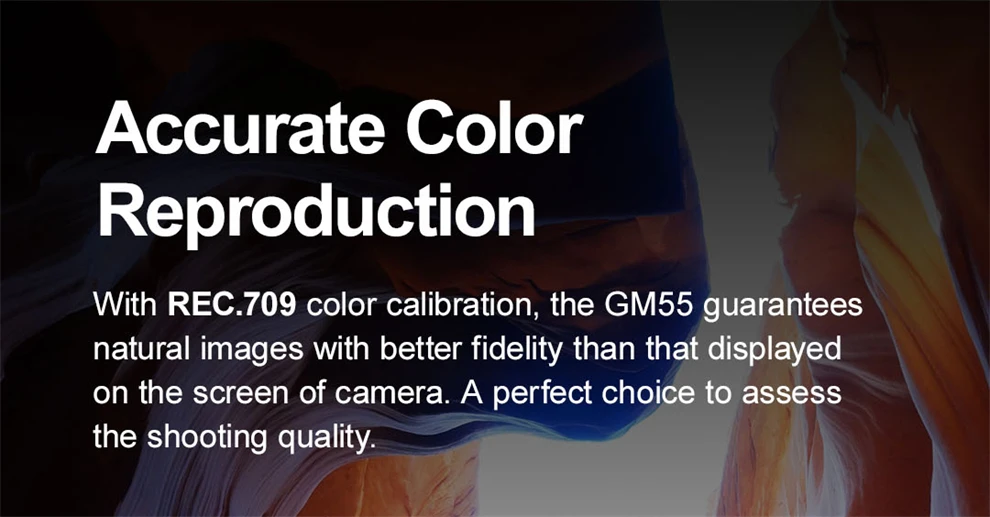 Точная цветопередача: благодаря REC.709 калибровке цвета GM55 гарантирует естественное изображение с лучшей точностью, чем на экране камеры. Идеальный выбор для оценки качества съемки.