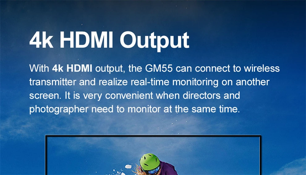 Совместим сВыход 4K-HDMI: с выходом 4K-HDMI GM55 может подключаться к беспроводному передатчику и осуществлять мониторинг в реальном времени на другом экране. Это очень удобно, когда Директорам и фотографам нужно контролировать одновременно.