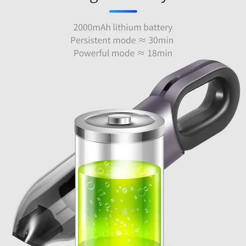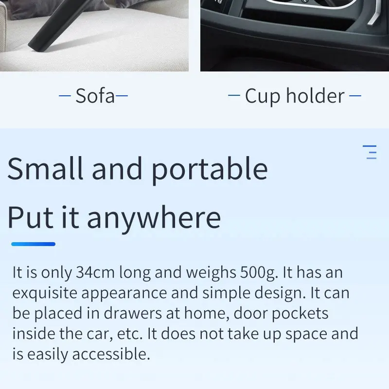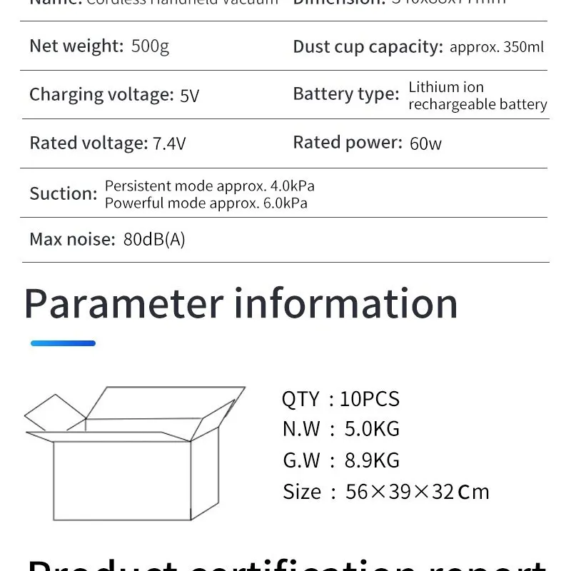 Cordless Handheld Vacuum Dimension Cordless Handheld Vacuum:340×88×77mm Net Weight:500g Dus Cup Capacity:Approx. 350ml Power Input:DC 5V 2A Interface Type:Micro-USB Rated Power:60W Max. Suction:6.0KPa