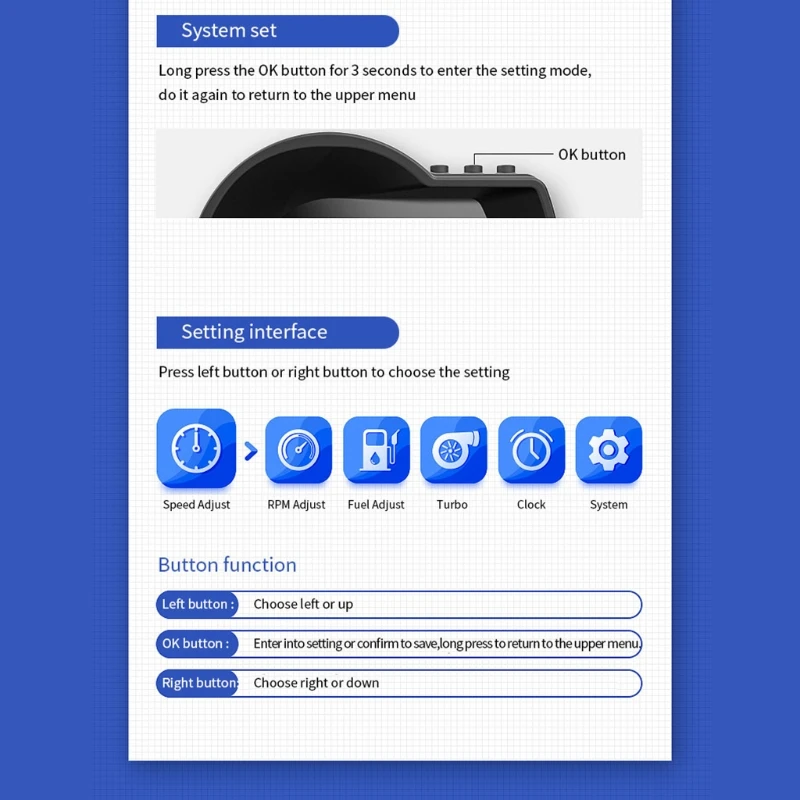 Свободное переключение между километром и милями, км/ч и MPH переключатель свободно, °C и Switch Переключатель свободно. Давление Турбины: PSI и KPA свободно переключаются. Единицы расхода топлива км/л и л/100 км