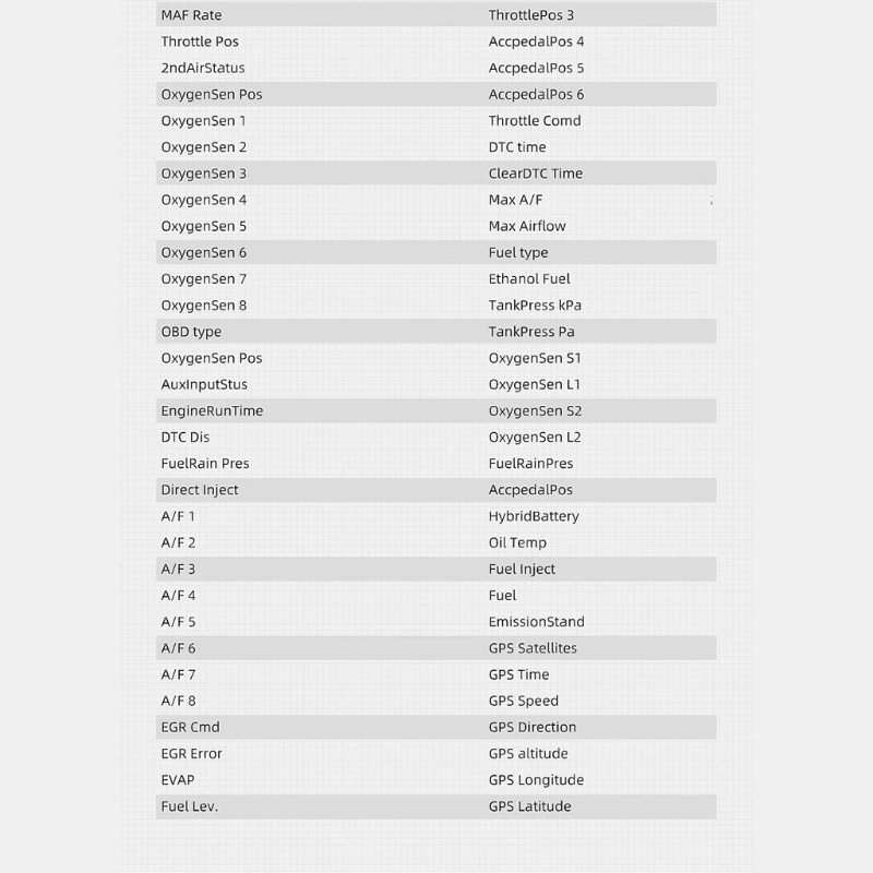 Режим GPS: скорость, высота, количество сателлитов, часы, расстояние одиночного вождения, время одиночного вождения, компас. Функция GPS может отображаться одновременно в режиме OBD.