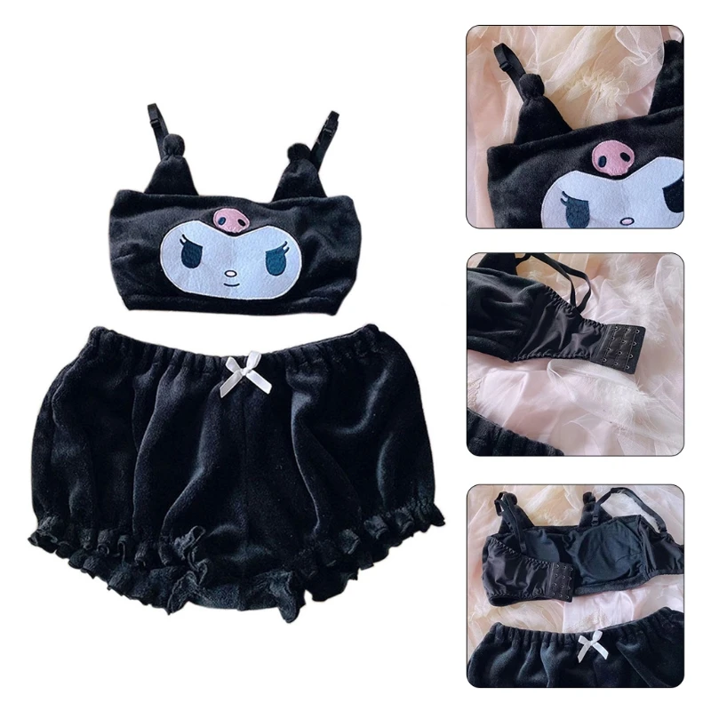 Женский бархатный пижамный комплект из 2 предметов в японском стиле с милым мультяшным злым рисунком, топ с ушками, шорты, одежда для сна, KawaiiОсобенности: