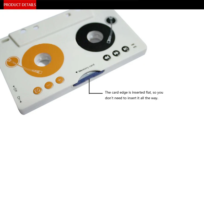 Используйте кассету в качестве автономного mp3-плеера или вставьте его в стереосистему автомобиля, чтобы воспроизвести все ваши любимые MP3 мелодии, прямо с вашей SD-карты.