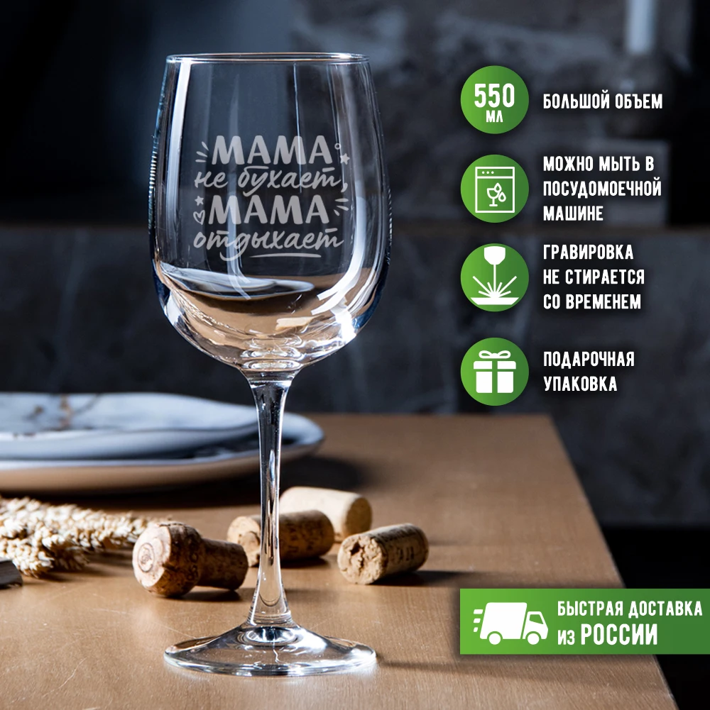 Бокал для вина "Мама не бухает, мама отдыхает" объемом 550 мл с нанесением текста методом лазерной гравировки.