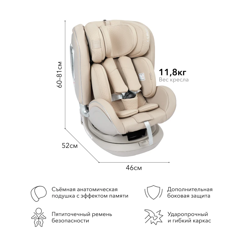 Для новорождённых предусмотрена анатомическая вкладка, которая поддерживает позвоночник. Подголовник и пятиточечные ремни с мягкими накладками регулируются в соответствии с ростом ребёнка. Полностью съёмный чехол обеспечивает простоту ухода за автокреслом.
