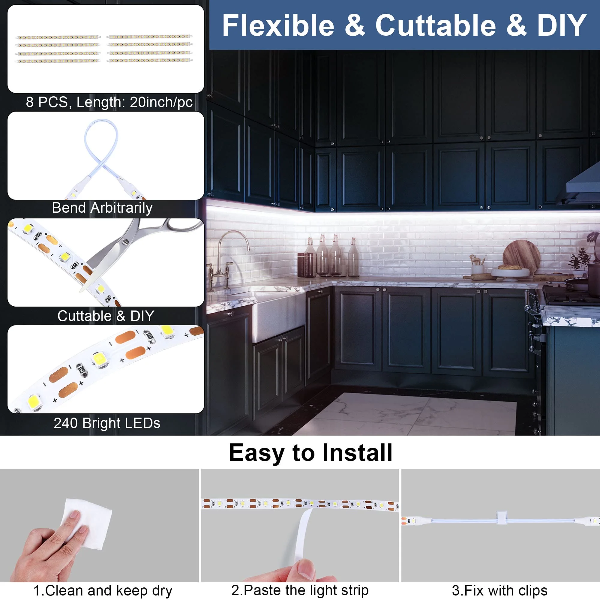 Описание:8 светильник-полоски (20 дюймов/шт), много видов методов установки, использование этого набора ограничено только вашим воображением. И вы можете свободно подгонять длину и разрезать на конце полосы-светильник, чтобы поместиться под короткий шкаф. 7 соединительных проводов (5,9 дюймов/шт) предназначены для сгибания и сгиба вокруг углов, вы можете даже удлинить и укоротить их по желанию