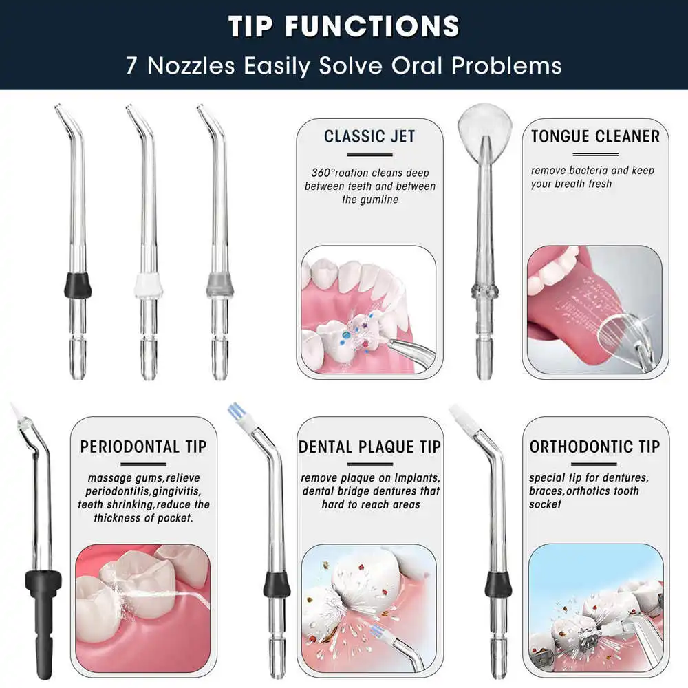 Высокая частота пульсации:С высокой частотой Пульсации воды 1250 -1700 раз в минуту, 360 ° вращая длинное сопло, Вода Flosser может глубоко очищать каждый угол точно, что традиционная чистка не может достичь.