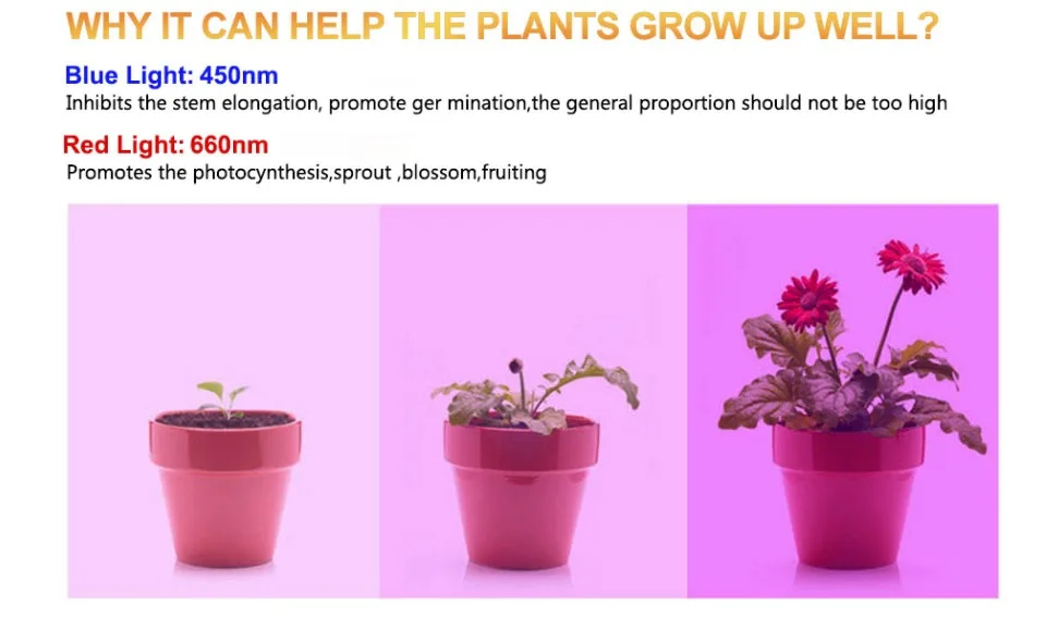 -Для роста и поглощения растений. Может повысить активность хлорпласта, чтобы предотвратить спиннинговое растение, но с другой стороны, это будет тормозить фотосинтез, так что растению нужен большой синий светильник.