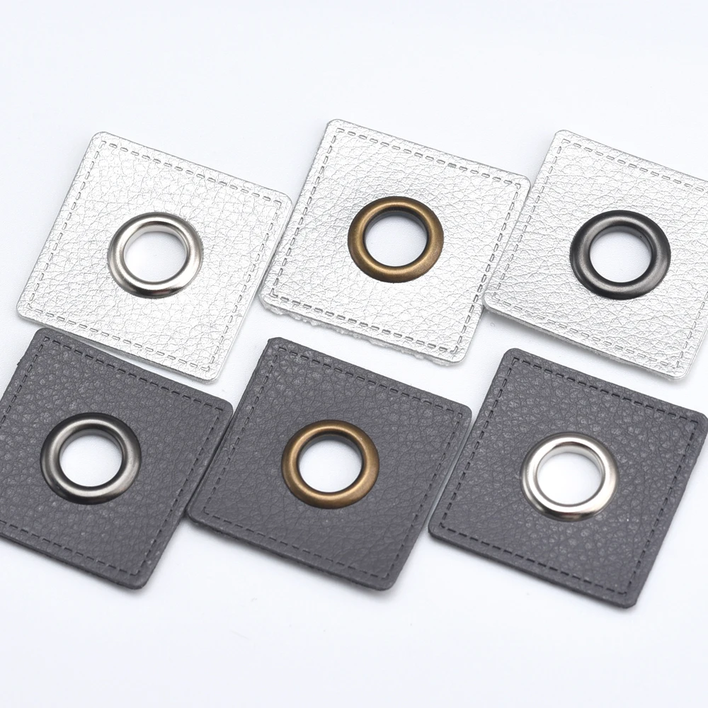 30 шт./лот 37 мм квадратная серая/Серебристая искусственная кожа ПРИШИТАЯ на значки накладные этикетки + внутренние 10 мм Металлические латунные люверсы Бесплатная доставка