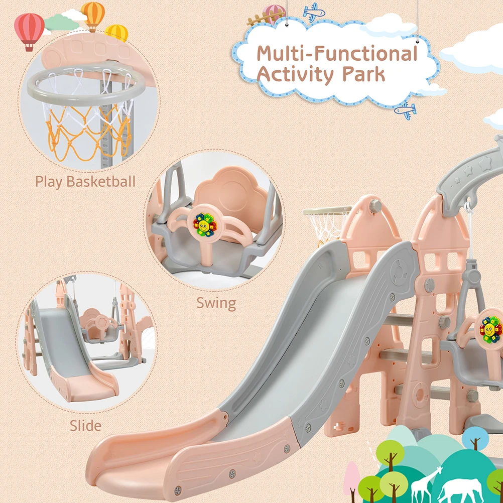- This 5-in-1 children slide has a slide, climbing frame, basketball hoops, soccer goal and swing, which offers many possibilities for children to explore freely. The slide can not only be fun for children, but also activate their body strength and build good motor skill adequately.