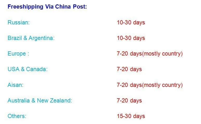 Если вы хотите более быструю доставку, пожалуйста, выберите Экспресс-доставку, мы предлагаем EMS,DHL,Fedex,Ups, русские почтовые отделения, Aramex и так далее.