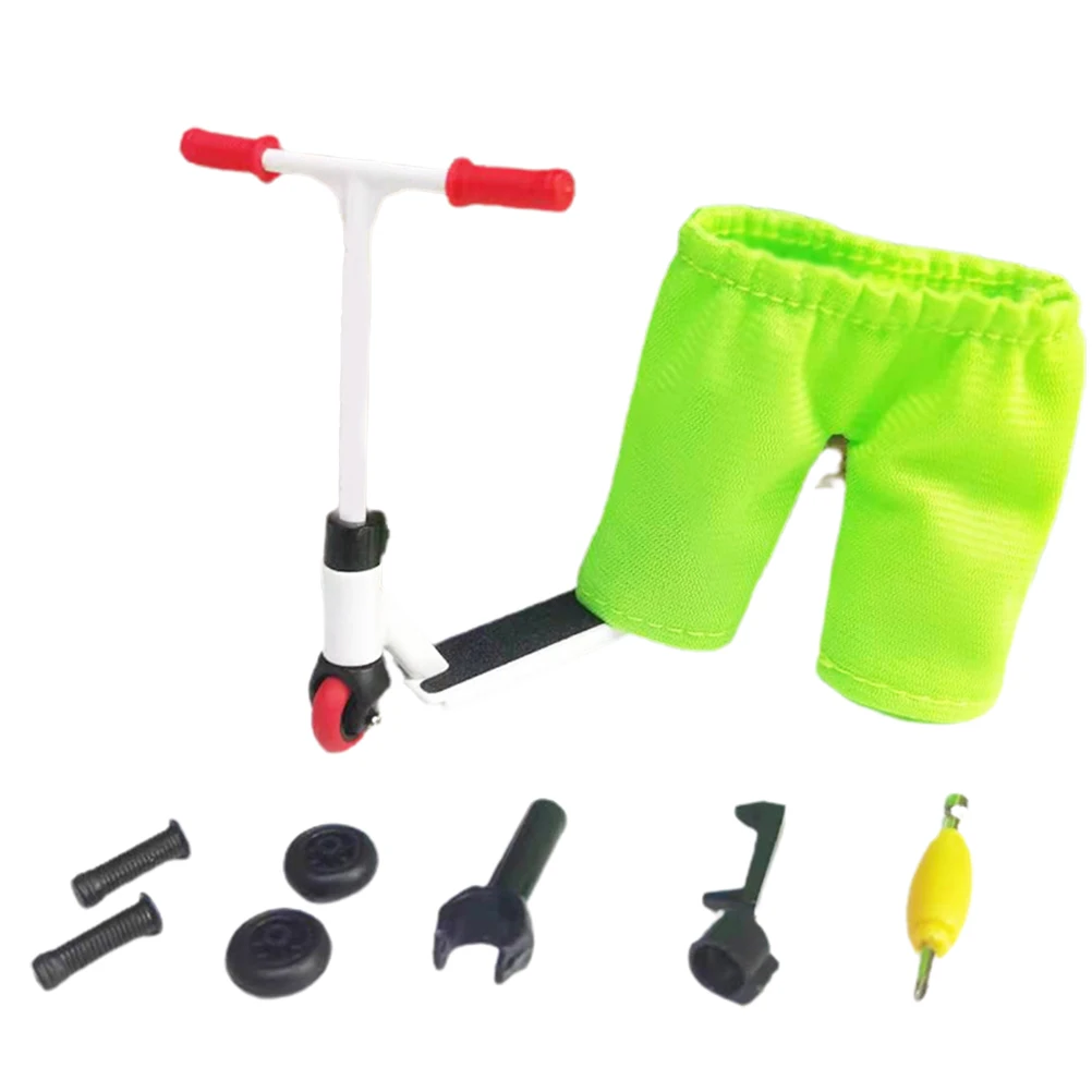 1. The package includes: Made of sturdy PVC and die-cast metal! 1 finger scooter, 1 finger pants, 7 disassembly and assembly kits.