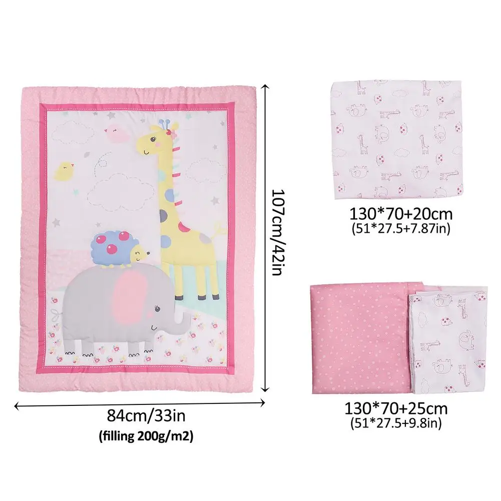 4. Комплект постельного белья из трех предметов: подходит для всех стандартных кроваток (52*28 дюймов), включая 1 одеяло в кроватку, около 84*107 см/33*42 дюйма, кроватки покрывает около 130*70 + 20 см (51*27,5 + 7.87in), детское постельное белье юбка около 130*70 + 25 см (51*27,5 + 9.8in).