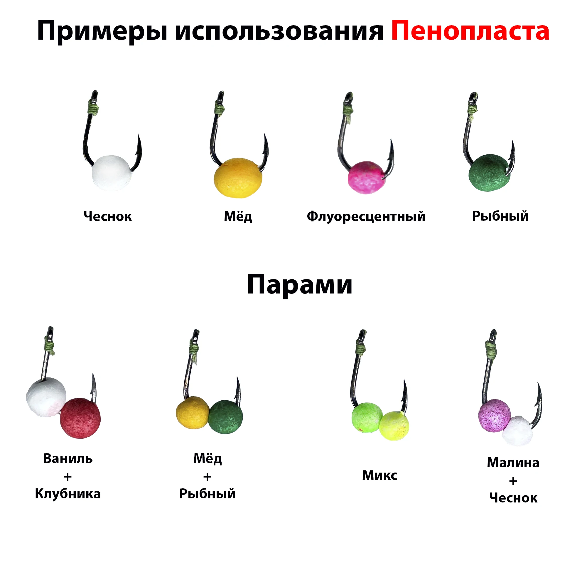 Плавающая насадка Пенопласт произведена путём окрашивания и ароматизации пенопласта. Имеет разные вкусы, запахи и цвета. Предназначена для ловли рыб различных пород. Используется путём надевания насадки на крючок.