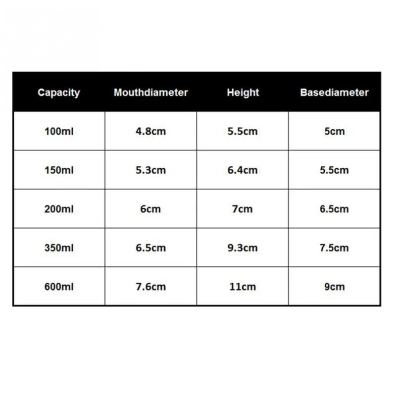 Емкость: 100 мл, 150 мл, 200 мл, 350 мл, 600 мл, 1000 мл