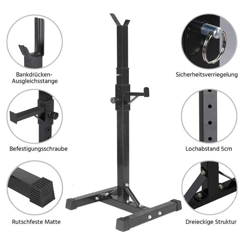 2. Это сверхпрочная стандартная стальная стойка для приседания, которая может использоваться для размещения штанги, выполнения различных упражнений, таких как тяжелая атлетика и приседания, а также использования отжиманий и упражнений на плечах