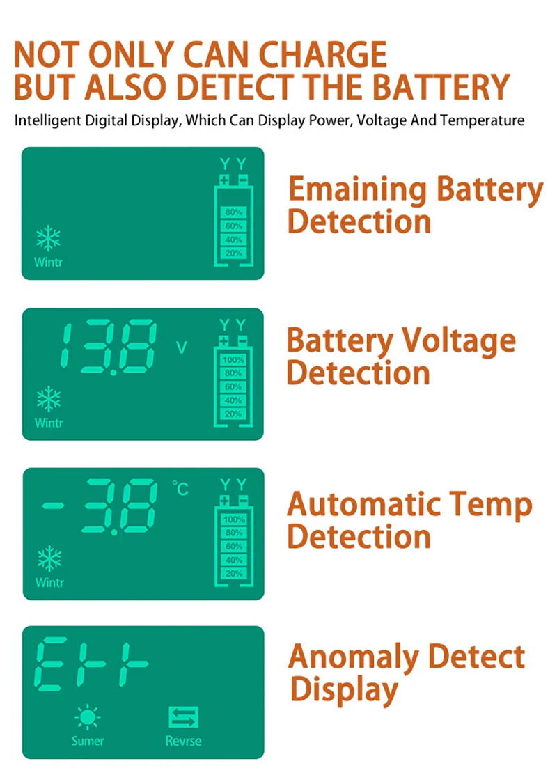 Микрокомпьютер автоматически распознает температуру окружающей среды и дает вам соответствующее зарядное напряжение для батареи в зависимости от сезона. Полностью заряжен зимой, перезаряжен летом, продлевает срок службы батареи.